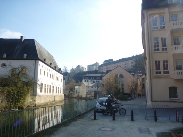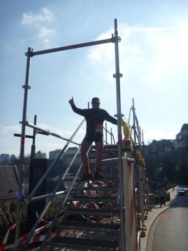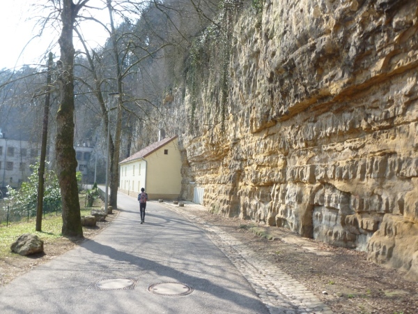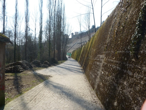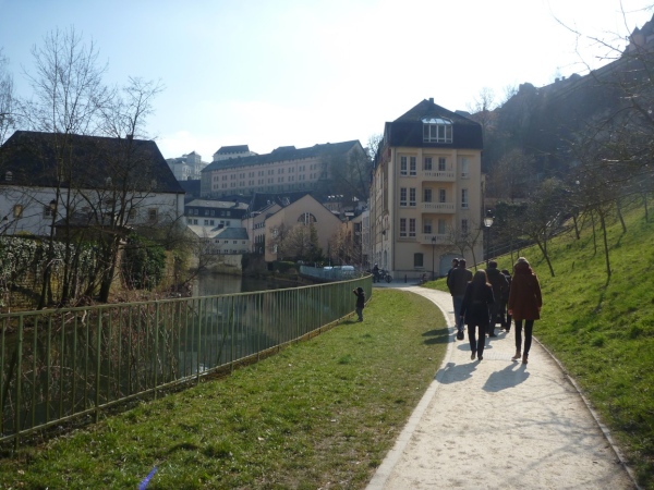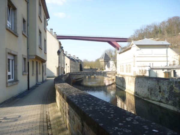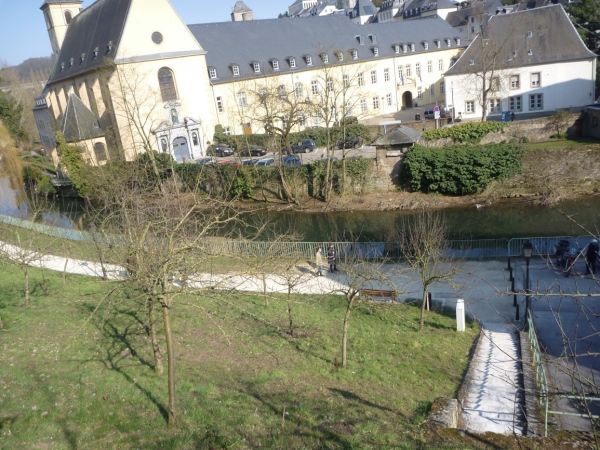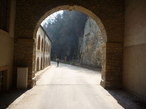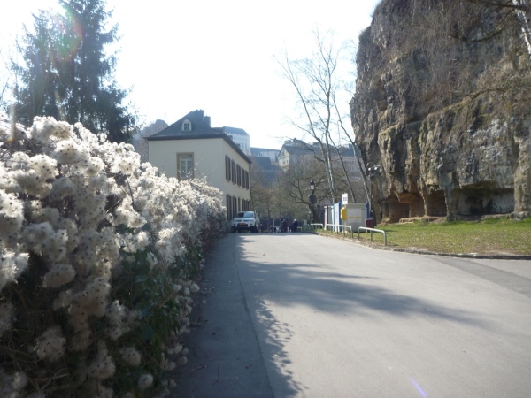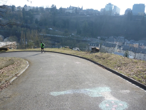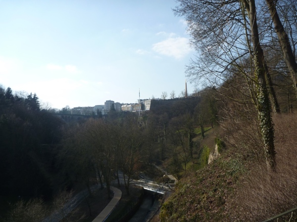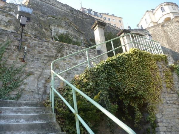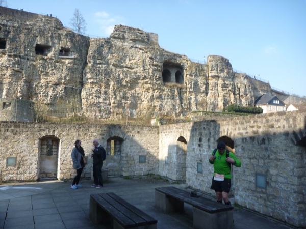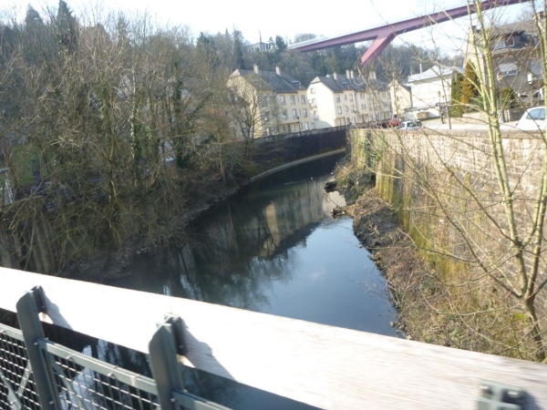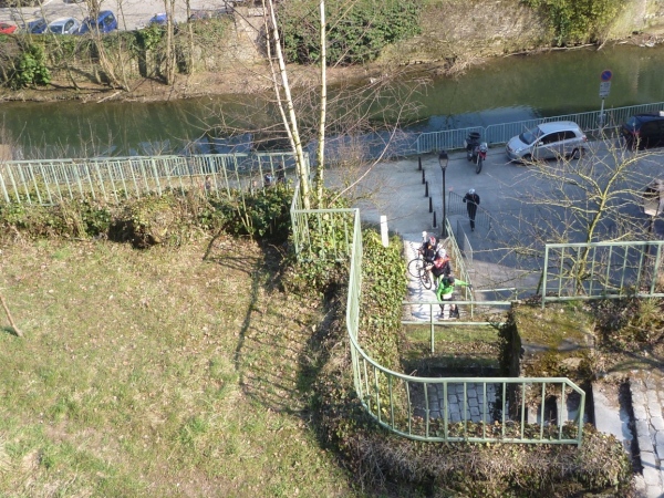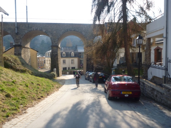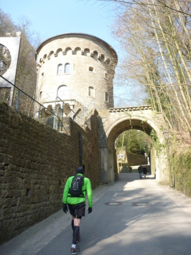 Aber Schub gibt das schon, 5 Plätze mache ich gut, ehe wir die - für heute nicht letzten - Stufen hoch zum Europazentrum dackeln. EU-Einrichtungen, RTL, Kongresszentren, Philharmonie, dann geht es direkt durch das Fort Thüngen und die Drai Eechelen. Schmale Durchlässe und dunkle Tunnel, und ruck-zuck wieder hinab ins Tal der Alzette. Äh, waren wir nicht gerade oben?
