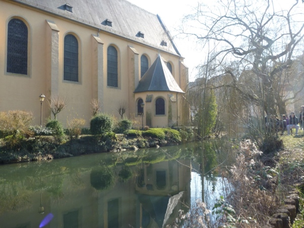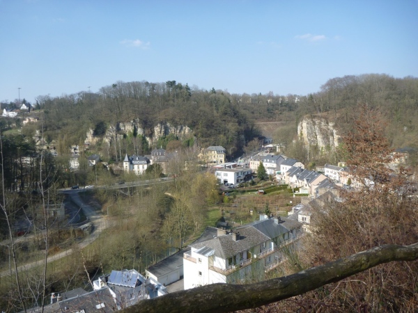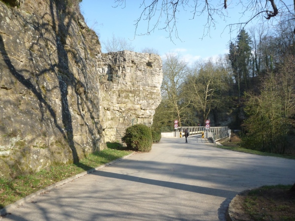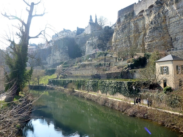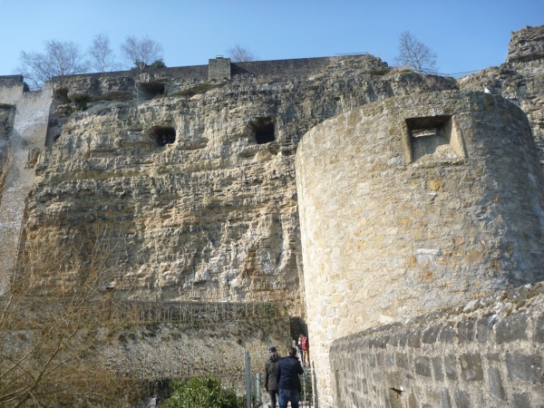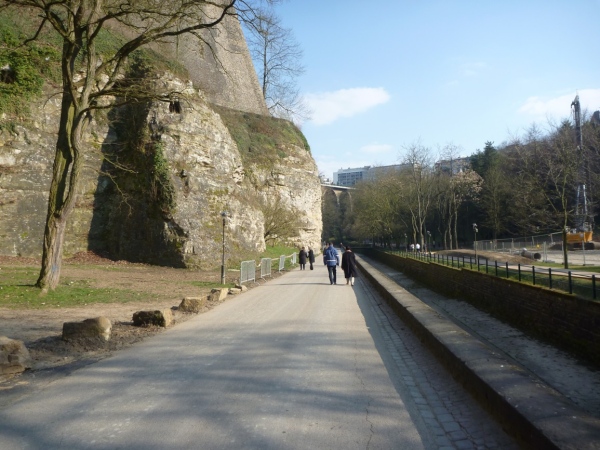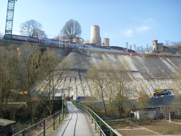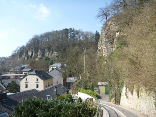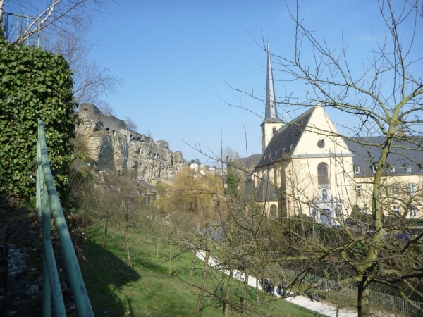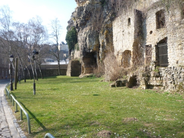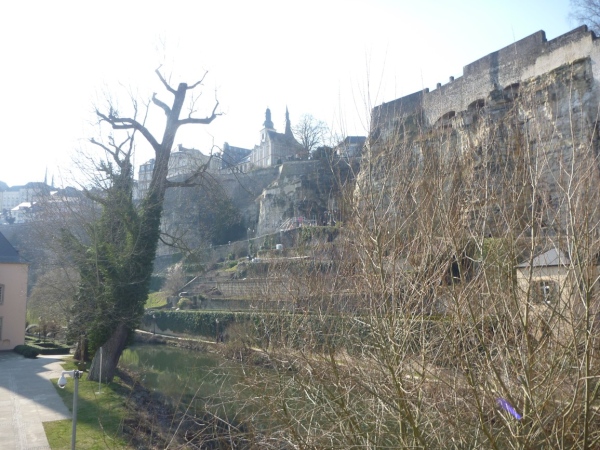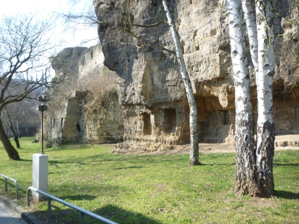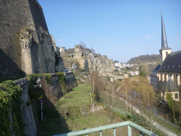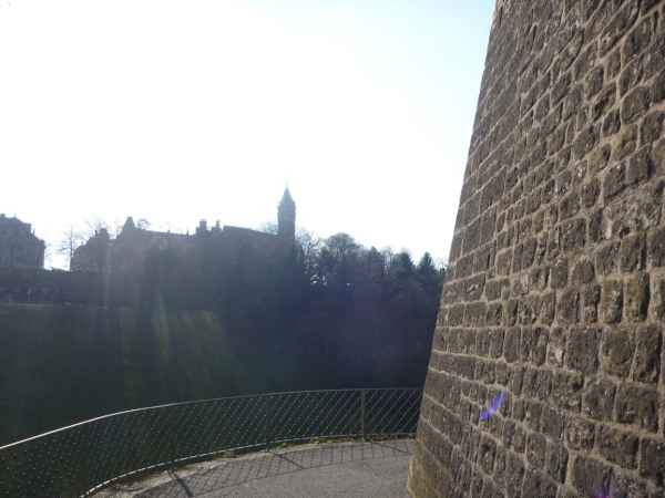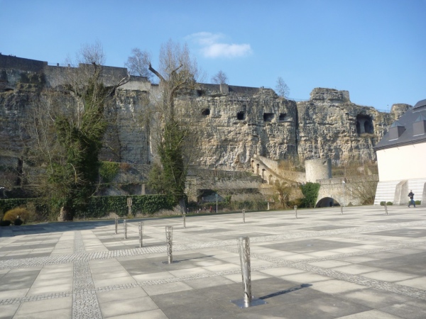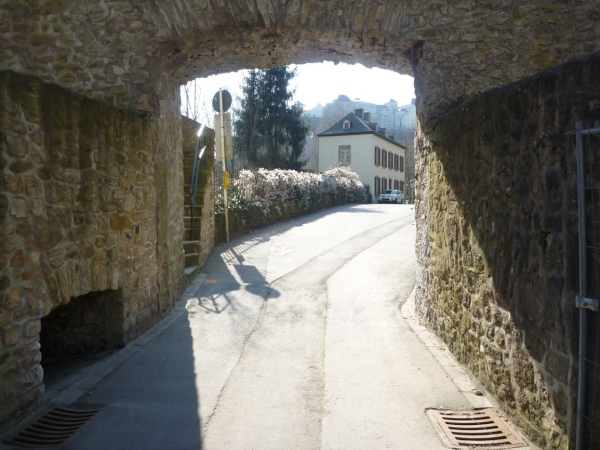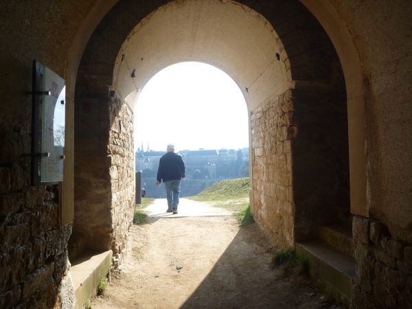 Es beginnt mit den Resten der Vauban-Feste, dann geht es durch die Abtei Neumünster, wieder zurück, die Alzette entlang, steil hinauf auf den Bock-Felsen, gesäumt von Spaziergängern, deren lange schwarze Mäntel nach altem Weihrauch, Gruft und Frittenbude stinken. Uralte, leere Fensterhöhlen grinsen mich mit ihren schwarzen Mündern an, drohen mit imaginären Kanonen und treiben mich zu Eile.
