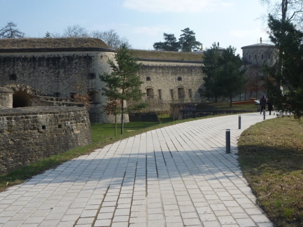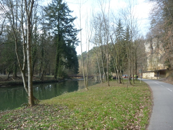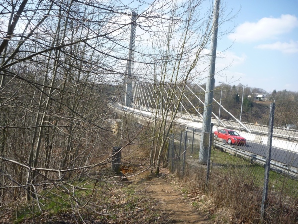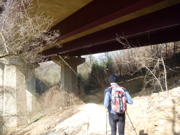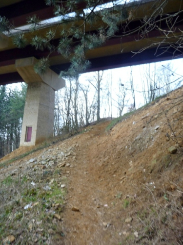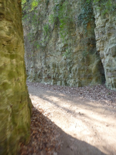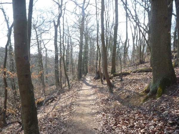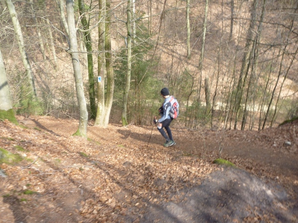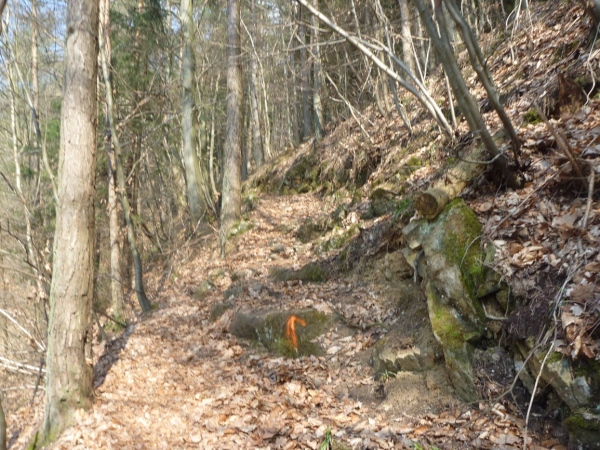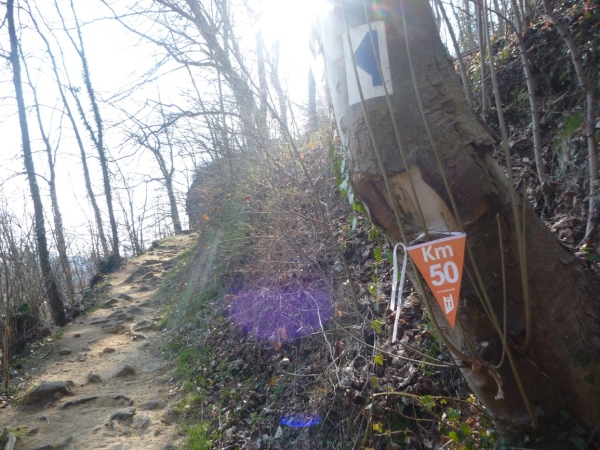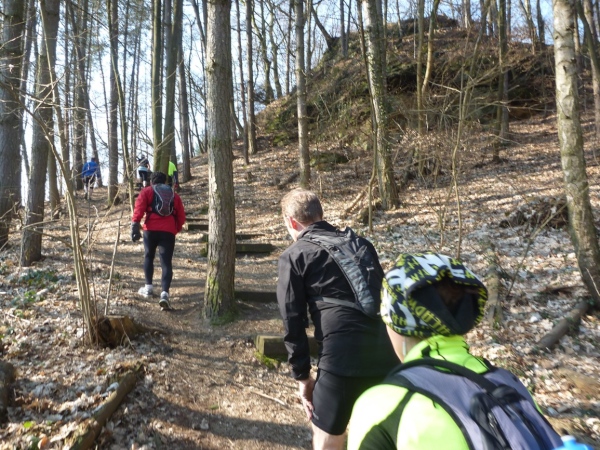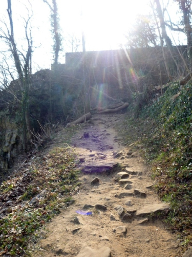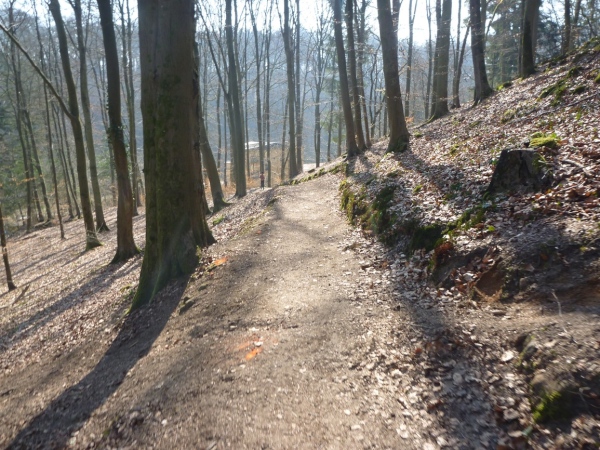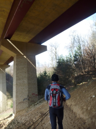 Vielleicht km 10, man weiß es nicht, km-Markierungen sind für Luschen, da beginnt irgendwie der Wald. Nicht irgendein Wald. Er ist durchsetzt mit alten Mauern und Treppen, die mit moderner Graffiti im Halbdunkeln leuchten, urige Plätze, Burgen und kriegerische Anlagen. Bunker, Tunnel und vergitterte Fenster, teils tausende Jahre alt. Dazwischen frühlingshafte, im Sonnenlicht verführerisch funkelnde Flussabschnitte mit springenden Forellen und finstere Autobahnbrücken mit eisigem Durchzug.