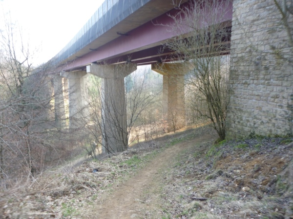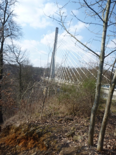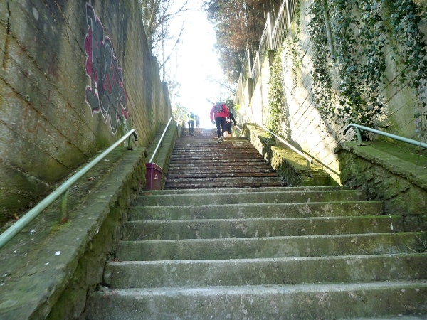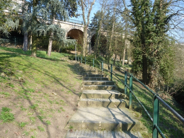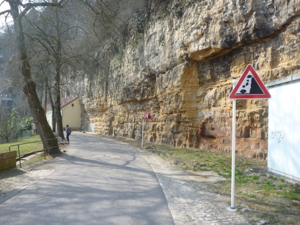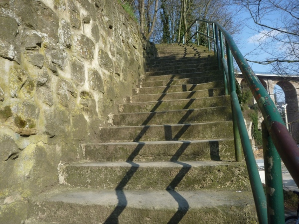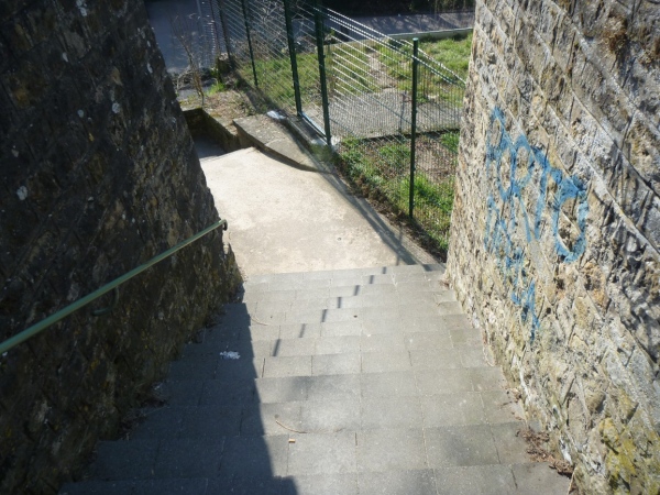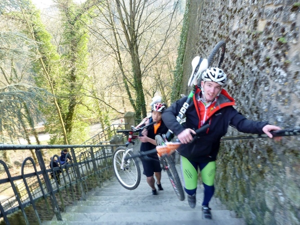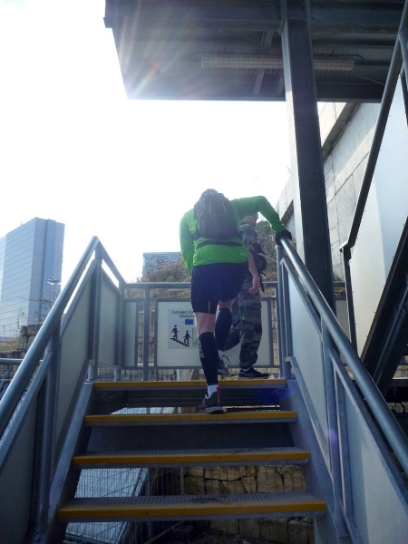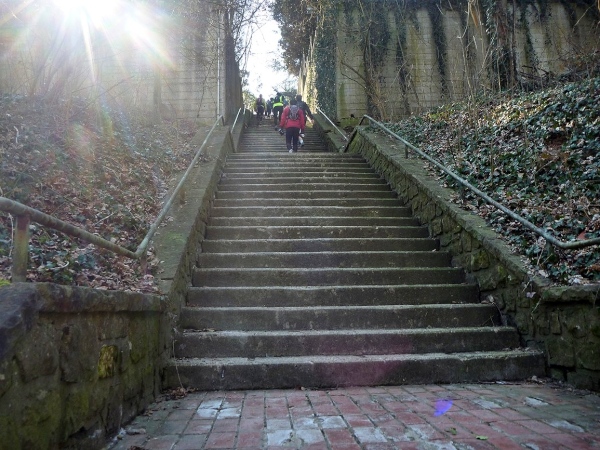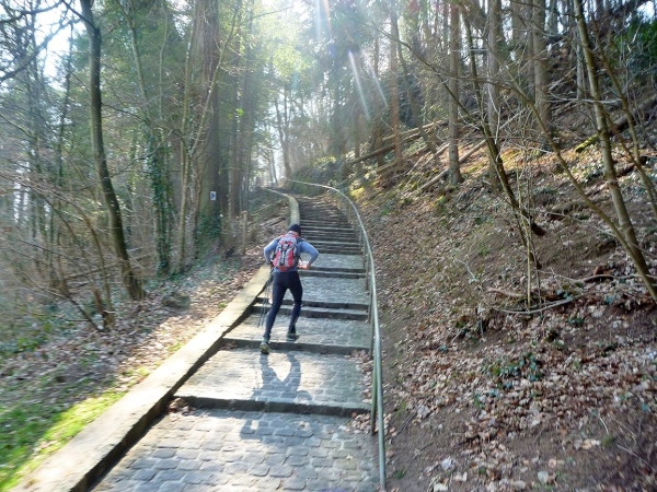 Dann geht’s hinab in das Alzettetal, durch das Viadukt der Passerele und zurück Richtung Grande-Duchesse Charlotte, um dann doch wieder die Richtung zu wechseln, um nach kurzem Abstieg die steilsten Treppchen der Welt zu nehmen, die dann wieder runterführen, über winzige Brücken und dann doch hinauf in die steilen Sandsteinfelsen, dann wieder aus Versehen nach unten abbrechen. Oh wie frei ist das Trailer-Leben! Frei wie ein Wiesel! Sinnfreies Trail-Hüpfen der feinsten Art, hirnverbrannte Wege für Idioten, die Nahrung aus Metalltüten lutschen. Und Gott sprach zum Menschen: Mach dir den Trail Untertan! Und siehe da, er hatte recht! Und Eva gab Rivella!
