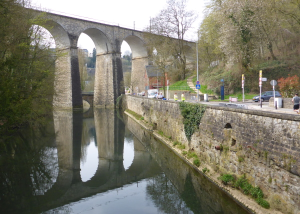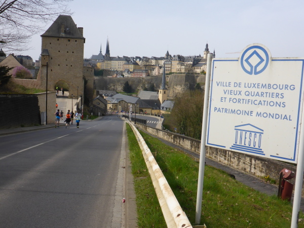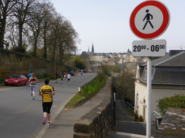 Vom Start geht es durch die Fussgängerzone Luxemburgs, bei km 1 vorbei am Palast des Großherzogs (Gran Ducal), über den Krautmarkt (Gewürzmarkt) mit dem Hotel des Chambre (dem Parlament). Bei km 2 grandioser Blick hinab ins Tal der Petruss und hinüber zum Bockfelsen, dann geht’s hinunter zum Fluss, vorbei am Staatsarchiv. Treppen, die meinen extrem abgemagerten Unterschenkeln Probleme bereiten, dann auf der Stadtmauer entlang, Wendeltreppen hinab und Eisengestelle hinauf. Es ist ein wunderbares Trailgebiet, auf kleinem Raum. Über uns die steinerne Eisenbahnbrücke, unter uns kleine Irrgärten mit Torbögen, Türmchen und verwinkelten Gassen.
