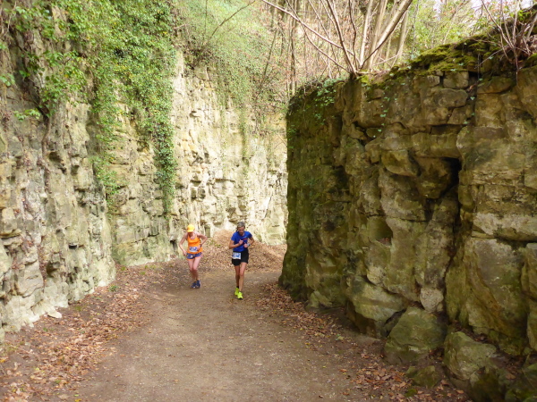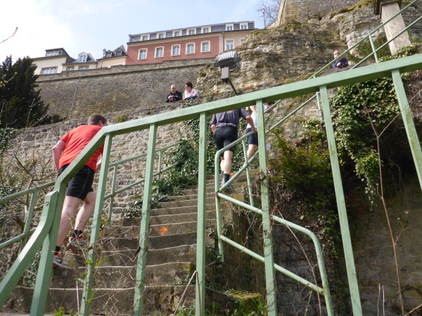 71 Sufen hinab, 55 hoch, 24 runter, 25 hoch - Km 5, Teilung der Laufstrecken. 109 Stufen hoch. Brücke, dann durch die Neumünster Abtei. Die alte Abtei Altmünster wurde durch Vauban zerstört, die Benediktiner bauten daraufhin Neumünster hier unten im Tal, (im Grund). Doch 120 Jahre später enteignete Napoleon den Kirchenbesitz, nun ist die Abtei ein Kulturzentrum.