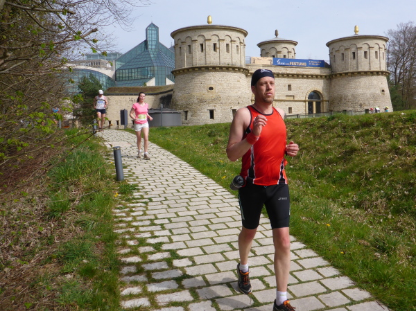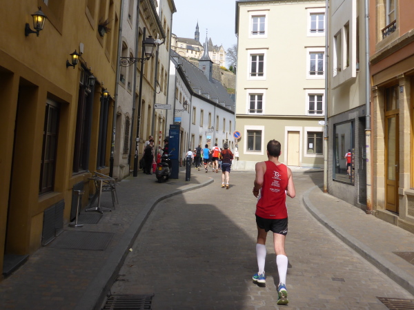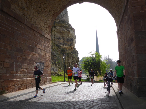 Treppen hoch und Austritt im Tal der Petrusse, die in einem schmalen Kanal geführt wird. Dann die Treppen hinauf zur Geelen Frau. Von oben feuern mich die Zuschauer an, wissen nicht, dass ich ursprünglich Ultraläufer bin. Ich passe noch auf, dass ich mir nicht wie letztes Jahr hier wieder die Hand breche, dann bin ich im Ziel.