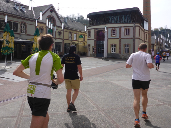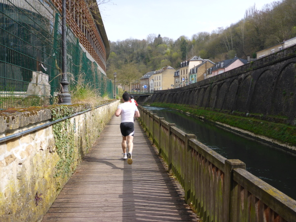 La Pport de Fort Obergrünwald, Km 10 Pfaffental, Überquerung der Alzette. Passenderweise laufen wir jetzt durch die Gasse „ Beim Beinchen“, welches mir muskelkatermäßig ganz schön schmerzt.