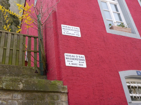 Km 2,5 entlang der Alzette, über uns der Bockfelsen. Wir sind im Stadtteil Grund, einem urigen Nightliveviertel. Wer es aus den Kneipen nicht mehr in die Oberstadt schafft, der kann heutzutage den Lift benutzen. Doch auch dort wohnt der Sterchesgescht. Links das Fort Rumigny. 218 Stufen hinauf.
