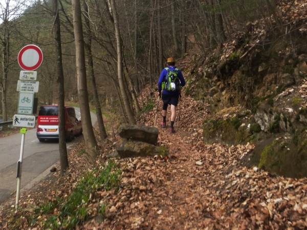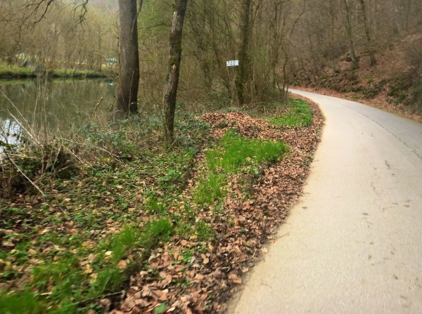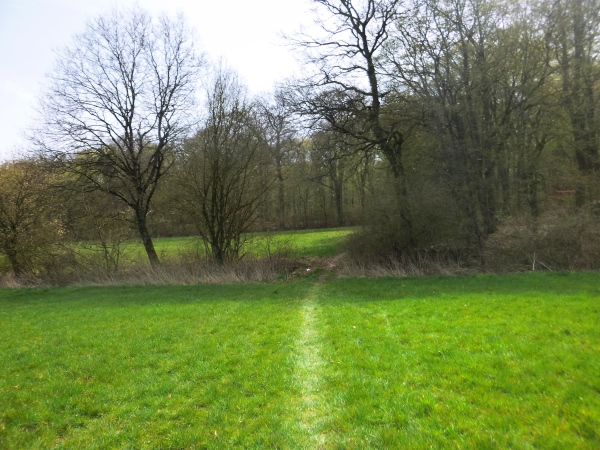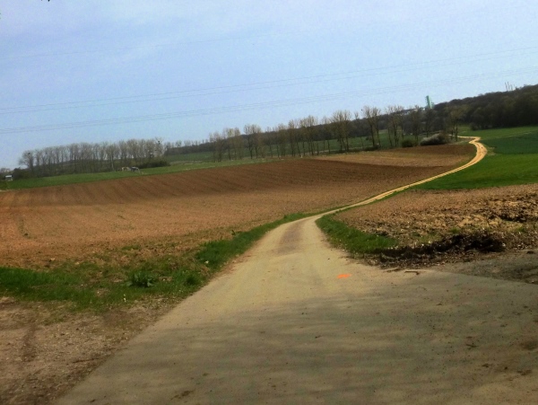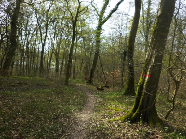 Ich genieße den Wald. Das erste Grün kommt schon zum Vorschein. Dazu blühen ganze Felder von Buschwindröschen und Veilchen im lichten Laubwald. Es ist völlig still. Das nahe Glockengeläut zeigt mir aber, dass bewohnte Gegend nicht weit sein kann. Dann folgen mir plötzlich Schritte. Chantal und Nora aus Luxemburg kommen von hinten. Ein paar aufmunternde Worte später sind sie vorbei. Da bleibe ich jetzt aber dran.