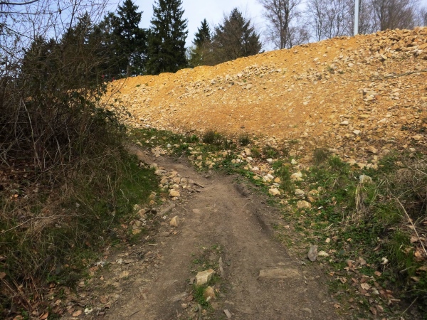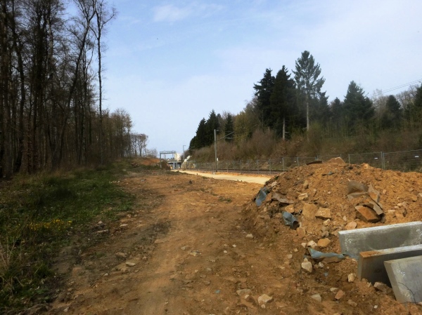 Ich laufe an einer hohen kahlen Böschung entlang. Weit oben verläuft die Zugtrasse. Nach ein paar Windungen im Wald geht es durch eine Baustelle zwischen übermannshohen Steinhaufen hindurch. Die Pfeile sind wirklich eindeutig, so dass ich nie in Gefahr bin, falsch zu laufen. Nun geht es an der Bahntrasse entlang. Auf der anderen Seite der Schienen kann ich durch die Bäume die weißen Marmorkreuze des amerikanischen Militärfriedhofs erkennen. Auf dem 21 ha großen Areal liegen über 5000 amerikanische Soldaten begraben, die während der deutschen Ardennenoffensive zum Ende des Zweiten Weltkrieges vom 16. bis 25. Dezember 1944 hier gefallen sind. Mit der Grabstätte des General George S. Patton Jr. wird diesem Soldatenfriedhof eine besondere Ehre zu Teil. General Patton verstarb am 21. Dezember 1945 in einem Heidelberger Militärhospital und wurde auf eigenen Wunsch auf dieser Kriegsgräberstätte, zwischen zwei Fahnenmasten, beigesetzt.