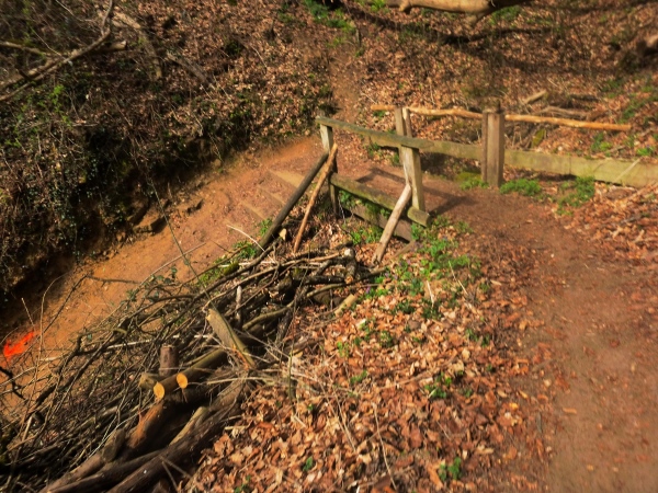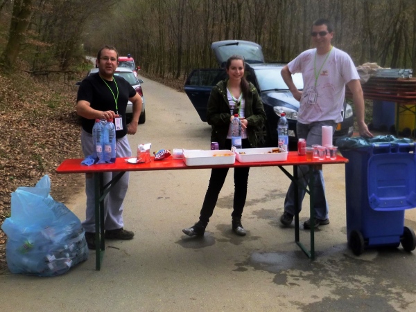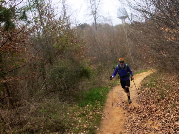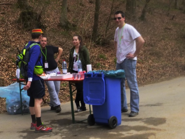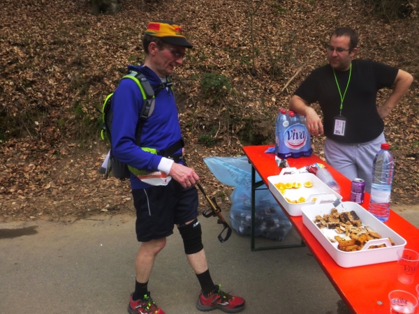 Bald finde ich mich im Wald wieder. Auch hier geht es erst mal Treppen hoch, dann aber wellig weiter. Der Untergrund ist optimal zu laufen. Zweimal muss man von Helfern gesichert über eine Straße, das ist aber kein Problem. Dann steht eine Helferin mitten auf dem Weg, sie weist mich nach rechts den Berg hinauf. Es ist ganz schön steil. Oben führt ein schmaler Trail wellig weiter, dann geht es wieder bergab. Aha, ich bin wieder auf dem gleichen Weg wie vorher. Das hätte man auch einfacher haben können, mehr Spaß macht aber die trailige Variante. Bei km 11,6 kommt dann die erste Essensstation mit Zwischenzeitmessung. Hier sieht es aus, als ob eine ganze Armee zu verpflegen sei. Vermutlich führen hier noch andere Strecken vorbei. Eigentlich habe ich noch keinen Hunger. Aber es gibt Orangenstücke und Honigkuchen, da greife ich gerne zu.