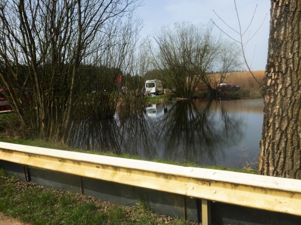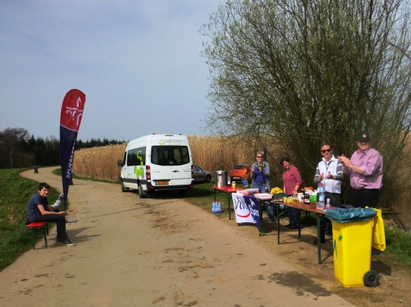 Mann bin ich fertig. Ich schalte den Kopf aus und setzte einfach einen Fuß vor den anderen. Plötzlich sind die vor mir laufenden Mädels verschwunden. Nur ein Auto steht wie eine Fata Morgana in der flirrenden Hitze auf dem Weg. Der Helfer weist mich rechts über die Wiese. Gleich bin ich im Schatten. Es geht noch ein Stück am Waldrand entlang und dann auf einen unwegsamen Wiesenpfad bis zur Straße. Hier (km 28,8) stehen, lauschig an einem kleinen See, motivierte Helfer. Schon von weitem klatschen sie mir zu und feuern mich an. Ich muss mich erst mal stärken. Die Hälfte der Strecke ist geschafft.