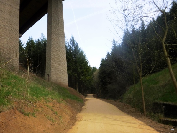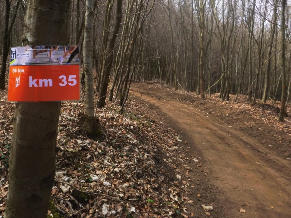 Über eine Treppe erreiche ich die Brücke. Hier hält ein Helfer ein Hinweisschild für die Läufer vom 56 km und 13 km Lauf hoch. Gleich folgt die Weiche für die Läufe. Helfer weisen mich nach rechts. Es geht relativ flach und gerade aus weiter.