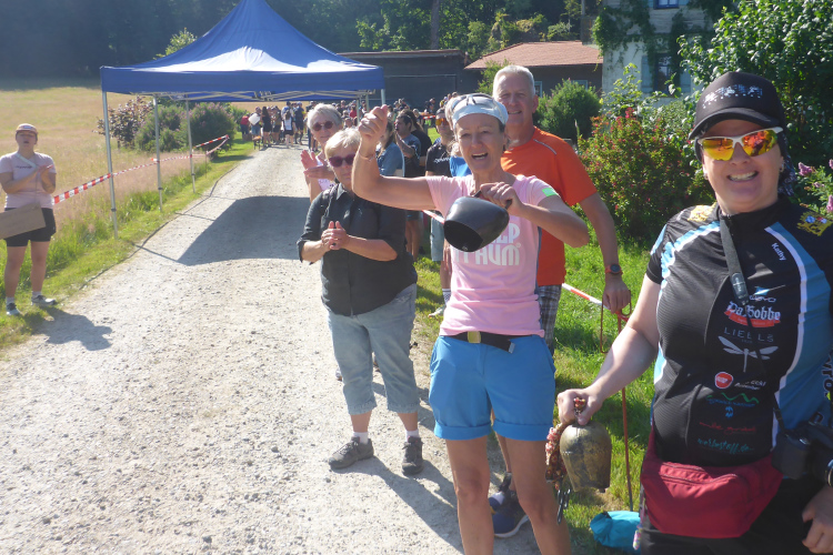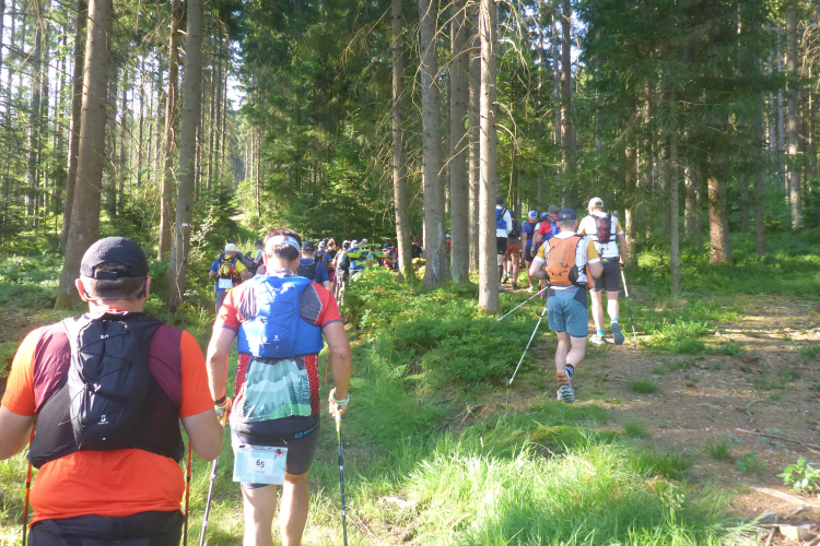 Nach knapp 9 km erreichen wir unsere erste Verpflegungsstelle am Ecker Sattel auf 843 m Höhe. Die Cut-Off-Zeit von 1:30 Std. ist kein Problem. Wir werden mit viel Beifall empfangen. Aufgrund der guten Erreichbarkeit ist hier ein gewaltiger Zuschauer-Hotspot. Wichtig ist jetzt für alle, die Getränke aufzufüllen, erst wieder in 15 Kilometern am Gipfel des Großen Arber kann aufgetankt werden.