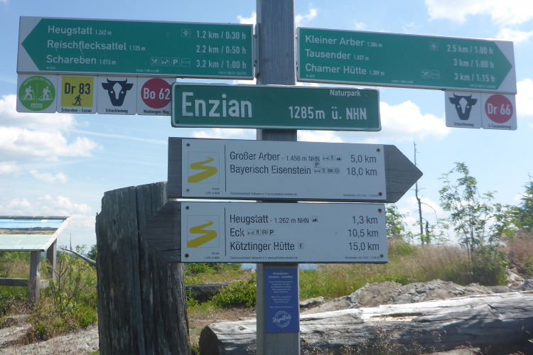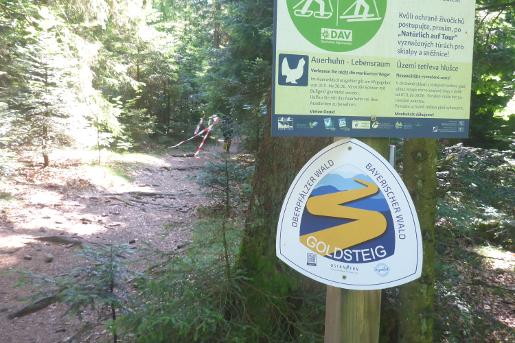 Nach Eck geht es kurz abwärts und schon befinden wir uns auf einem der schönsten Abschnitte des Goldsteigs. Mit einer Länge von 660 Kilometern ist der Goldsteig der längste zertifizierte Fernwanderweg in Deutschland. Die Goldsteig-Etappe N13 nennt sich auch 8-Tausender Tour und ist zugleich auch ein Abschnitt unseres Trails. Bis zum Gipfel des Arber könnten wir jetzt praktisch auch seinen permanent ausgeschilderten, markanten goldgelben Zeichen folgen, um auf der Strecke zu bleiben. Ich versuche, alle Gipfel auszumachen, das ist gar nicht so leicht.