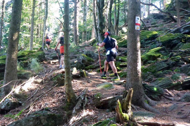 Über größtenteils wurzelige und steinige Trails geht es meist wellig weiter, zwischendrin warten auch einige kleine Klettereinheiten auf uns. Das „40 to go“ Schild weist uns auf die noch vor uns liegenden Kilometer hin. Insgesamt ist die Strecke wirklich hervorragend ausgeschildert, überwiegend mit neongelben Punkten am Boden oder Fels. Oft ist auch über dem Goldsteig-Tafeln die rote permanent-Beschilderung mit dem Magic U. auszumachen.