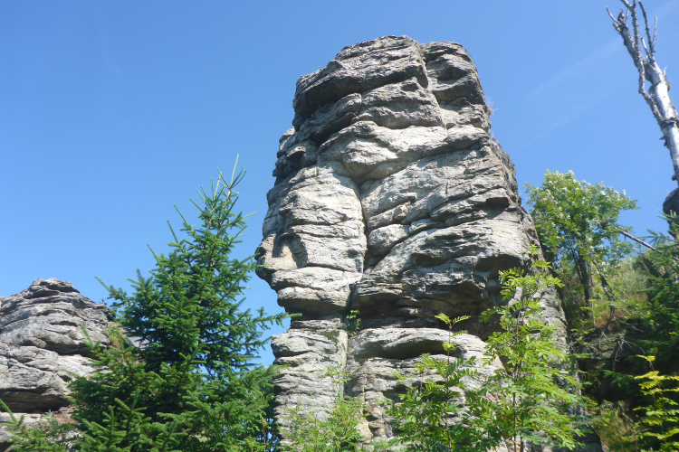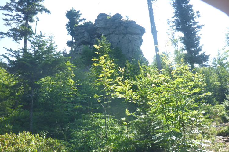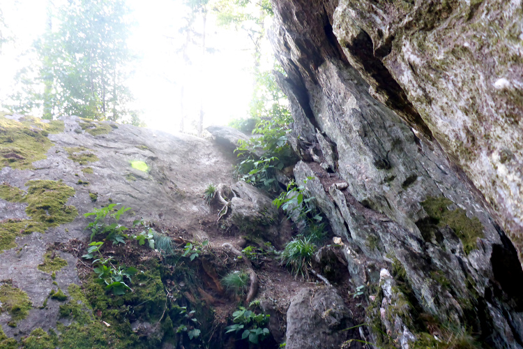 Die kleine Pause und Stärkung haben mir gutgetan, es läuft jetzt wieder besser. Bevor es richtig Abwärts geht, dürfen wir unterhalb des Gipfels des Kleinen Osser noch einige Klettereinheiten einlegen. Auf einem anspruchsvollen Pfad über armdicke Wurzeln und mannshohe Felsen geht es noch mehrmals rauf und runter.