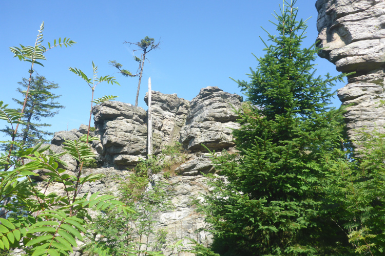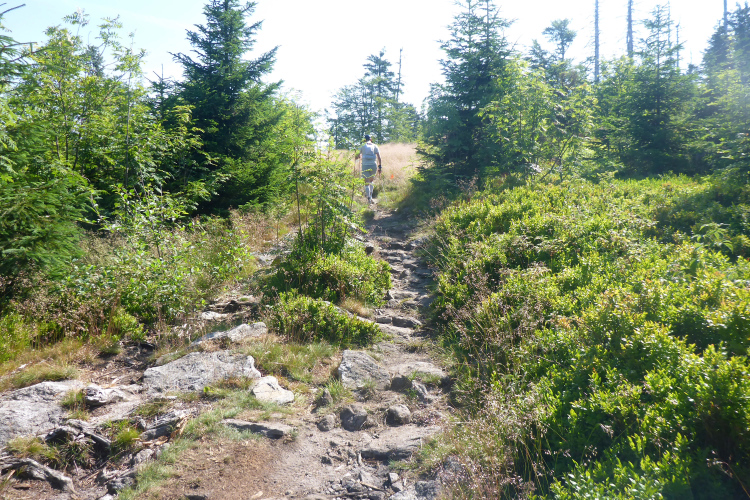 Stark verwurzelte und verblockte Pfade machen den steilen Aufstieg zu einer Herausforderung. Ich bin aber bei weitem nicht der Einzige, der sich hier hochquält. An einem Felsriegel mit Gipfelkreuz ist der einen Kilometer lange Aufstieg über den Zwerchecker Steig beendet. Ich habe viel Kraft gelassen und bin jetzt wieder über meinem Marschtempo. Über den weitflächigen, abgerundeten Gipfel laufen wir an weiß-blauen Grenzstangen entlang. Der Weg führt durch niedriges Buschwerk und ist sehr steinig und ruppig. Etwa einen Kilometer ziehen wir am Grenzkamm entlang. Östlich liegt der Böhmerwald, wie wir, rechts von den Stangen, somit statten wir wohl gerade Tschechien einen Besuch ab.