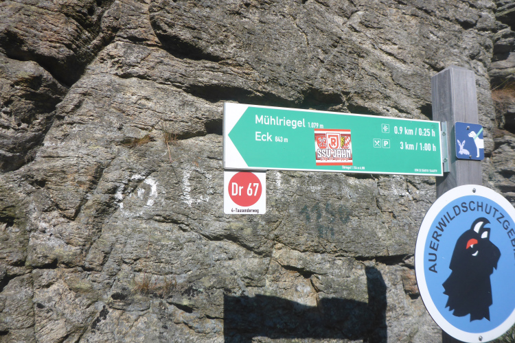 Ich empfinde den Einstieg als sehr angenehm, über Wurzeln und Steine geht es nicht sonderlich steil und immer wieder mit laufbaren Abschnitten aufwärts. Dazu befinden wir uns im Wald, wo noch angenehme Temperaturen herrschen. Unser erster Tausender ist der Mühlriegel auf 1080 m. Hätte ich nicht das grüne Hinweisschild im Wald gesehen, wäre ich unbemerkt daran vorbeigelaufen. Die letzten Meter empor auf den Gipfel und zum Kreuz liegen nämlich nicht direkt auf unserem Weg.