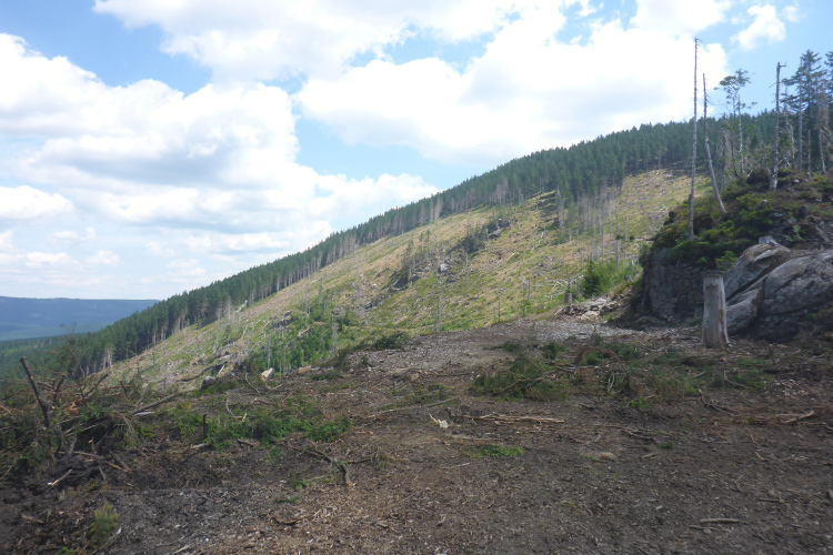 Durch eine von Baumsterben geprägte Landschaft, beginnt unser Aufstieg zum Großen Arber auf einem ruppigen Pfad. Wenig später kommen wir an der Zufahrtsstraße, die auf den Gipfel führt, wieder raus aus dem Gelände. Aber bereits nach 500 Metern auf der kommoden Schotterpiste verlassen wir diese schon wieder. Steil geht es auf einem mit vielen Granitstufen abgestützten Hang weiter, fast auf direktem Weg nach oben. Der Gipfel des Großen Arber liegt auf 1456 m. Nur ein relativ bescheidenes Holzkreuz ziert den höchsten Punkt des Kine vom Bayerischen Wald, so wird der Große Arber auch gerne genannt und natürlich ist er auch Namensgeber des Ultra Trails.