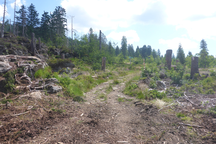 Etwas durchatmen können wir auf der Osserwiese, bis in die 50er Jahre wurden Jungrinder und Stiere auf diese Freifläche getrieben. Nach dem Ende der Waldweide wurden viele dieser Plätze aufgeforstet oder wuchsen über Jahre hinweg zu. Im Rahmen einer Landschaftspflegeaktion wurde der Baumbestand aber wieder entfernt. So können wir uns heute auf einem wunderschönen Trail durch Borstgras und Heidekraut schlängeln. Der letzte Abschnitt unseres Downhills wird nochmal richtig heftig, auf einer groben Schotterpiste geht es streng bergab.