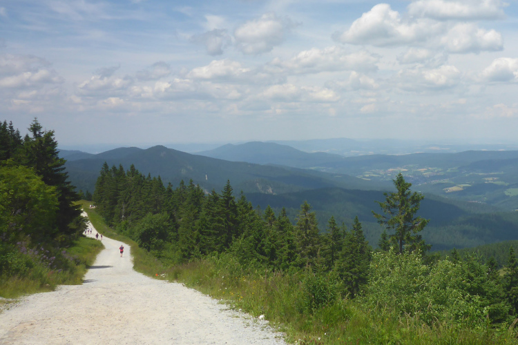 Bis zum Einstieg in den Ossersteig liegen nun etwa 5 km leicht abfallend auf einer Schotterstraße vor uns. Normalerweise eine gute Möglichkeit, wieder Zeit gut zu machen, aber meine Beine wollen gerade partout nicht mehr wirklich laufen. Mit nur sporadischen Laufeinsätzen kann ich nix gut machen. Vor dem Aufstieg zum Osser wurde noch eine weitere Wasserstelle eingerichtet. Als ich dort ankomme, müsste ich laut Zeitplan bereits auf dem Gipfel des Osser sein. Das Zeitlimit von 11 Stunden ist somit in weite Ferne gerückt, bzw. praktisch unerreichbar. Ich spiele ernsthaft mit dem Gedanken hier die Segel zu streichen. Die zwei Mädels von der Wasserstation sind davon nicht so begeistert und motivieren mit weiterzulaufen. Dann soll es wohl so sein.