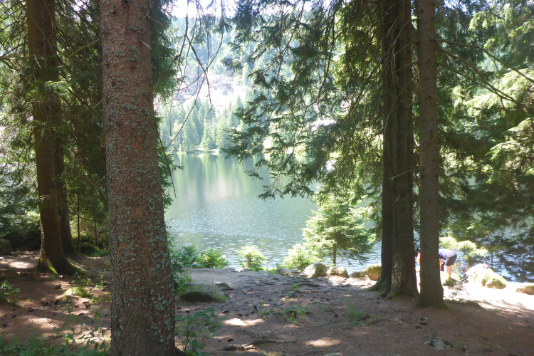 Gerne wäre ich noch etwas sitzengeblieben, aber ich muss weiter …mein Zeitplan. Die 8-Tausender Tour ist am Arber beendet, aber natürlich nicht unser Trail. Jetzt geht’s erstmal lange owie. Vor uns liegen 800 negative Höhenmeter in einem Rutsch. Auf einer brettlebenen Naturstraße geht es zunächst los. Nach anderthalb Kilometer werden wir nach links in den Wald geleitet. Jetzt ist es wieder Konzentration angesagt beim rasanten Downhill, der Schotterweg ist doch deutlich ruppiger und man muss wieder etwas mehr auf den Untergrund achten. Bis zum Kleinen Arbersee sind es gut 4 km, ich kann bis auf einen kurzen Trailabschnitt vor dem Arbersee zügig durchlaufen.