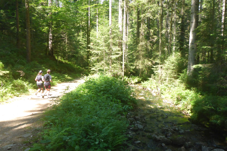 Auf halben Weg vom Arbersee führt unsere Strecke an den Sollerbach, dem wir bis ganz nach unten folgen. Zu gerne würde ich einmal den einen Meter hinabsteigen und mir eine Mütze Wasser genehmigen, aber ich möchte auch meinen Lauf gerade nicht unterbrechen und an den Mädels dranbleiben. Den tiefsten Punkt unseres Downhills erreichen wir nach 32,5 km. Einen Kilometer führt uns ein Weg an der Weißer Regen entlang schwach bergan, ehe wir nach überqueren einer kleinen Kreisstraße zum Parkplatz an der Reischbrücke gelangen.
