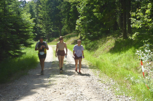 Unser nächster Aufstieg führt uns auf den Kamm des Künischen Gebirges zum Zwercheck auf 1333 m Höhe. Auf dem Bergrücken verläuft die Grenze zwischen Bayern und Böhmen. Bevor es ernst wird, dürfen wir aber noch für 500 Meter einer Forststraße folgen. Ich werde immer noch von dem Mädchen begleitet, das mich vorhin zurückholen sollte. Noch ein paar weitere Mitläuferinnen und -läufer haben sich kurz nach mir auf den Weg gemacht und liegen nach meiner Eskapade jetzt vor mir. Direkt vor mir läuft Ingo, wir sind uns heute auch schon öfters begegnet. Er wird ebenfalls von einer jungen Läuferin ohne Startnummer begleitet. Da wir beiden, gerade die letzten auf der Strecke sind, hege ich die Befürchtung, dass man uns bereits Besenläufer an die Seite gestellt hat. Viel später, klärt mich Ingo auf, dass es seine Töchter sind. Sie sind bereits am Vormittag den Rookie-Trail gelaufen und begleiten jetzt den Papa ab Scheiben bis ins Ziel. Das lob ich mir, so brauchen wir uns über den Nachwuchs keine Sorgen machen.