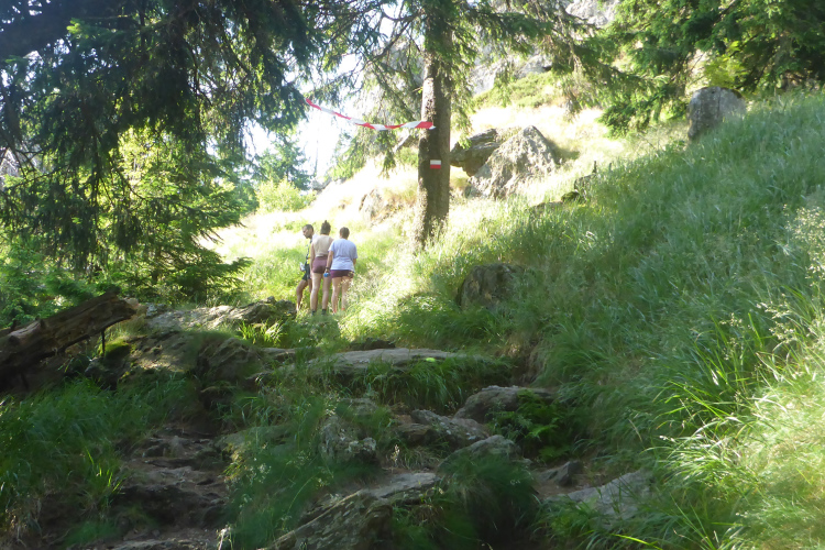 Ein kurzer Abschnitt unseres Weges ist mit Holzplanken ausgelegt, vermutlich befinden wir uns hier in einem Feuchtgebiet, durch die Trockenheit der letzten Monate, ist in den Graswiesen aber nur mehr wenig Nass übriggeblieben. Auf den Gipfel des Kleinen Arber (1384 m) dürfen wir wieder etwas aufsteigen. Das Gipfelkreuz liegt von unserem Weg aus kommend, ziemlich gut in den Bäumen versteckt. Erst kurz vor der finalen Kletterpartie bekommen wir es zu Gesicht. Oliver hat seinen Lauf auch mal wieder gestoppt und wartet angespannt auf seinen Bruder.