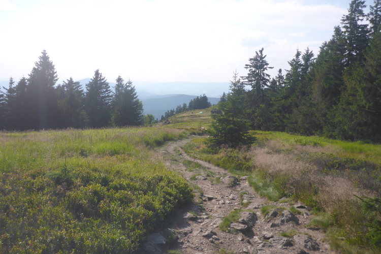 Über den 1285 m hoch gelegenen flachen Gipfel des Enzian folgen wir weiter dem Kammweg. Unsere nächsten Etappenziele, die Gipfel des Kleinen und Großen Arber mit seinen markanten Radarstationen haben wir schon mal in unserem Blickfeld. Mittlerweile sind auch einige Wolken aufgezogen und es weht gelegentlich auch ein ganz lreichtes Lüftchen, was unser Vorwärtskommen relativ angenehm gestaltet.