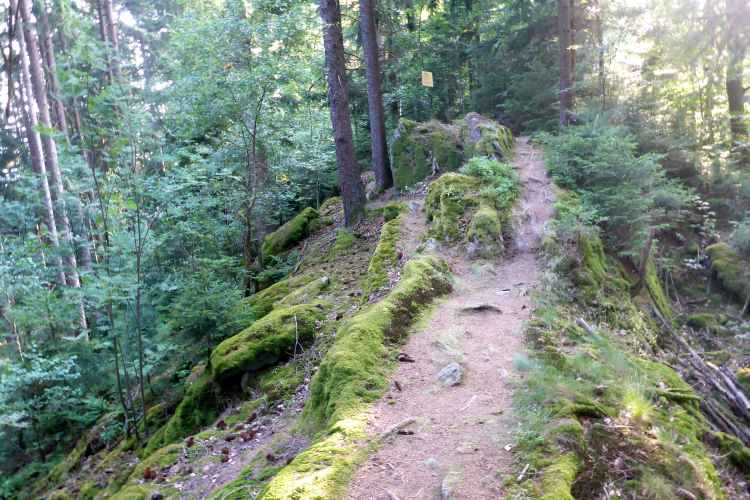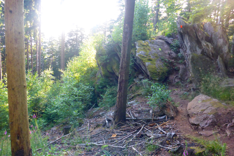 In Anlehnung an dieses Rennen hat man diesen Abschnitt Tromsö getauft, der zwar eine Nummer kleiner als das Original ist, aber mindestens genauso viel Spaß bereitet. Fußbreite Pfade auf wunderbar weichen Waldböden wechseln sich ab mit kurzen, ausgesetzten Graten und immer an diesen fabelhaften, fast vollkommen von Moos bewachsen grünen Felsbrocken vorbei. Nur langsam komme ich voran, ich möchte dieses aufregende Felsenensemble auch richtig aufsaugen. Zudem könnte ein Fehltritt natürlich auch fatal sein. Es geht zwar nie allzu weit runter, aber es würde vermutlich trotzdem schlecht ausgehen. Aber ich habe Zeit, zur Hälfte des Bayerwald-Tromsö ist meine Sollzeit abgelaufen, was soll ich mir noch Stress machen.