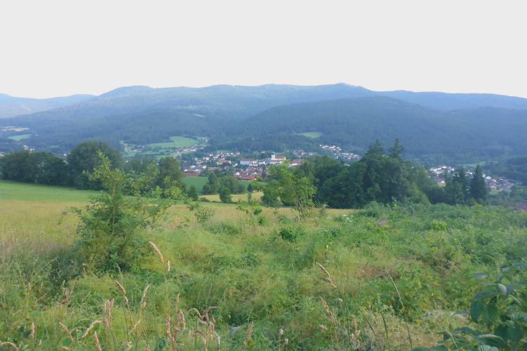 Nach einer kurzen steilen Rampe verläuft der weitere Anstieg relativ gleichmäßig und unspektakulär. Aber laufbar ist die durchgängige Steigung für mich nicht mehr, so zieht sich der Kurs dahin und die Zeit verrinnt. Auf meiner Uhr sind die 36 km längst durch, aber Scheiben noch lange nicht in Sichtweite. Jetzt wird es zeitmäßig für mich doch nochmal eng. Eine lange Gerade am Waldrand entlang bietet als Abwechslung wieder einen schönen Fernblick auf den Großen Arber.