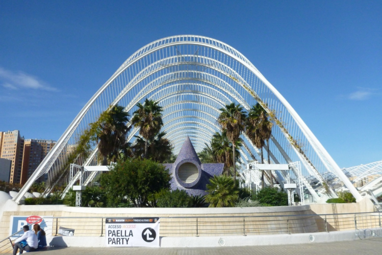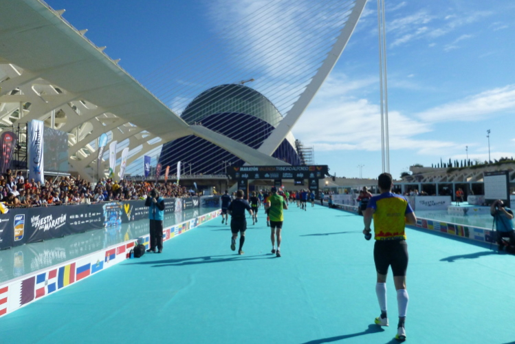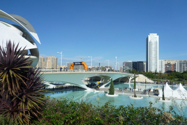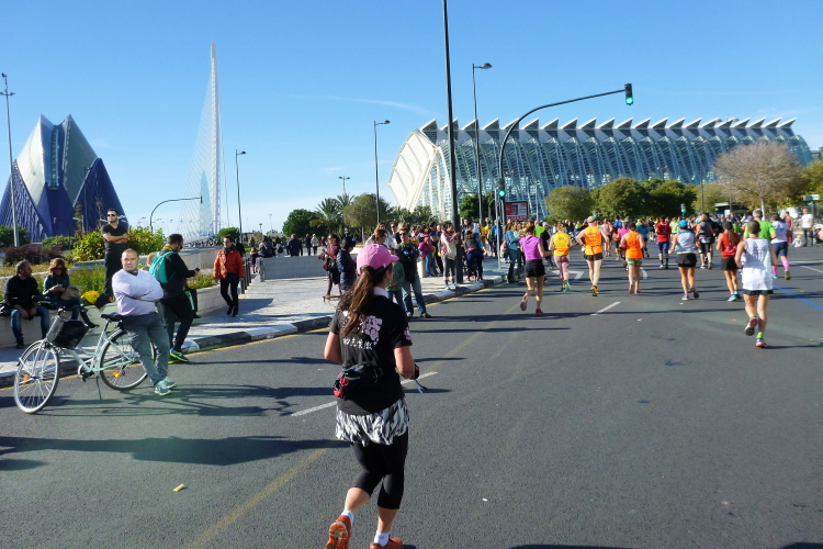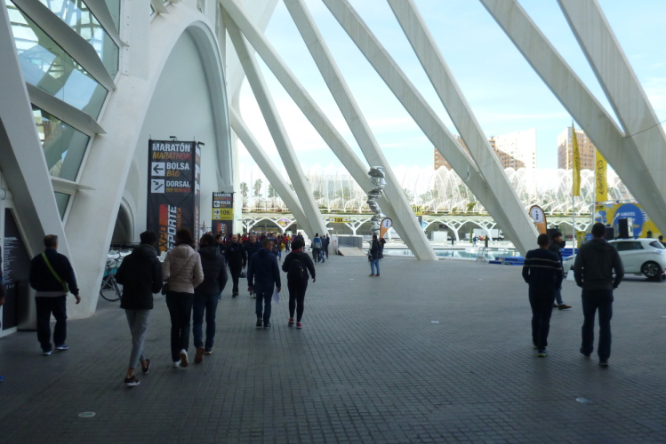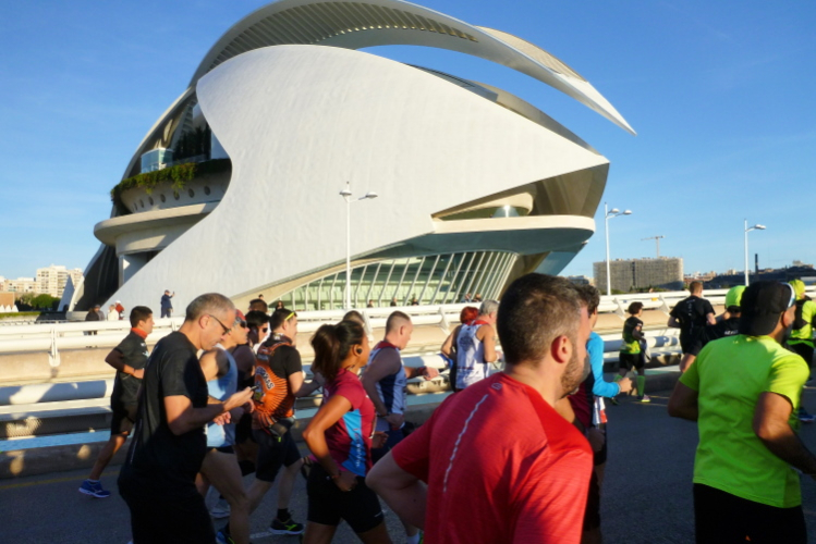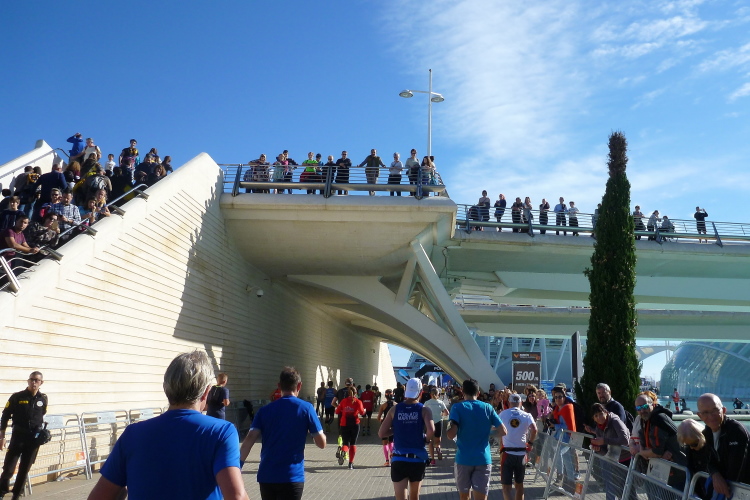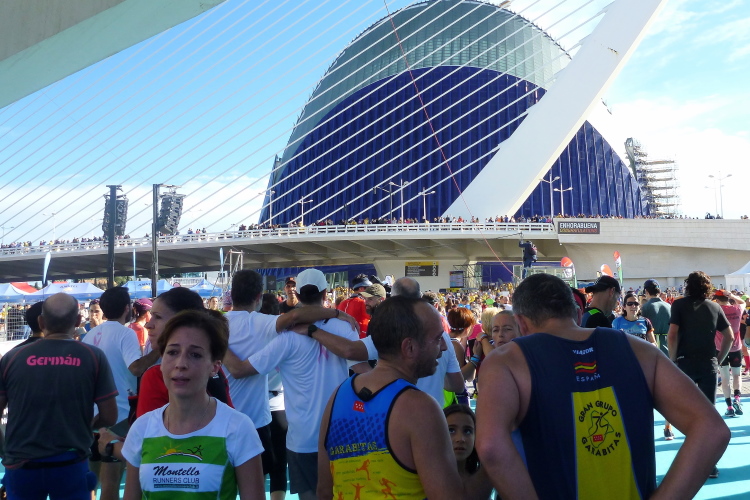 Am meerseitigen Ende des Parks wurde die Ciutat de les Arts i les Ciències, also die Stadt der Künste und Wissenschaften, errichtet. Die neu entstandenen Gebäudekomplexe geben dem Ganzen ein futuristisches Aussehen und werden gerade den Zieleinlauf in einem spektakulären Ambiente stattfinden lassen. Bis dahin müssen wir jedoch erst einmal gestartet sein, was um 08:30 Uhr auf einer breiten Straße unmittelbar am Park beginnt. Ich quatsche noch lange mit José aus dem Hotel und zweien seiner Marathon-Rookies, bis wir gemeinsam nach 20 Minuten im vorletzten von neun Blöcken die Startlinie überschreiten. Wir unterqueren dabei unter lautstarker Anfeuerung den 41 m breiten und 10 m hohen Start“Bogen“ („Einer der weltweit größten!“) und überqueren auf der Pont de Montolivet direkt den Park, zur Linken das prächtige Opernhaus, zur Rechten u.a. das IMAX-Kino. Brücke? Ja, natürlich haben sie beim Umbau des Flußbettes die Brücken stehen lassen. Gerade von unten betrachtet sind das schon geile Aussichten, insbesondere auf den späteren Zielbereich.