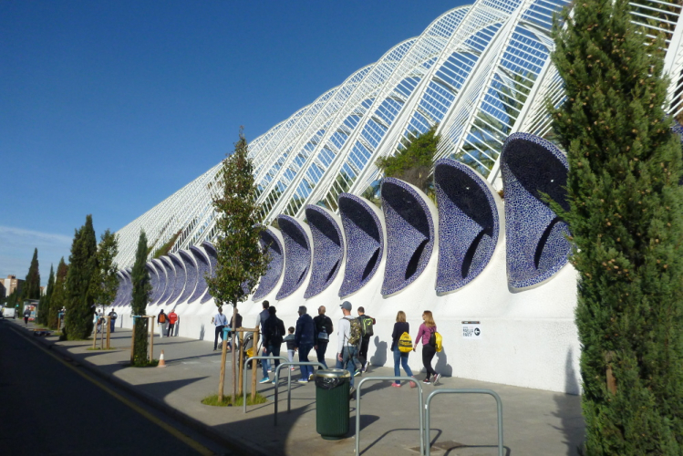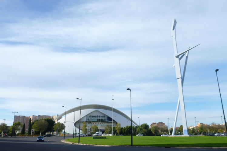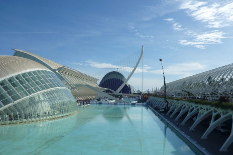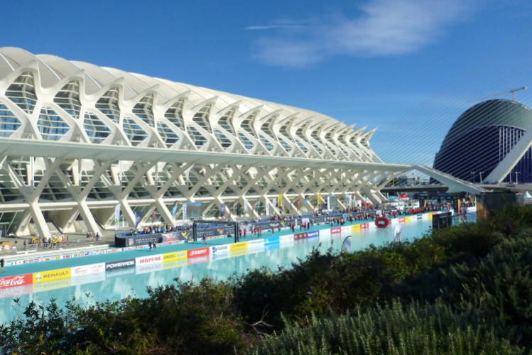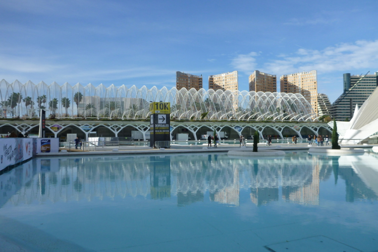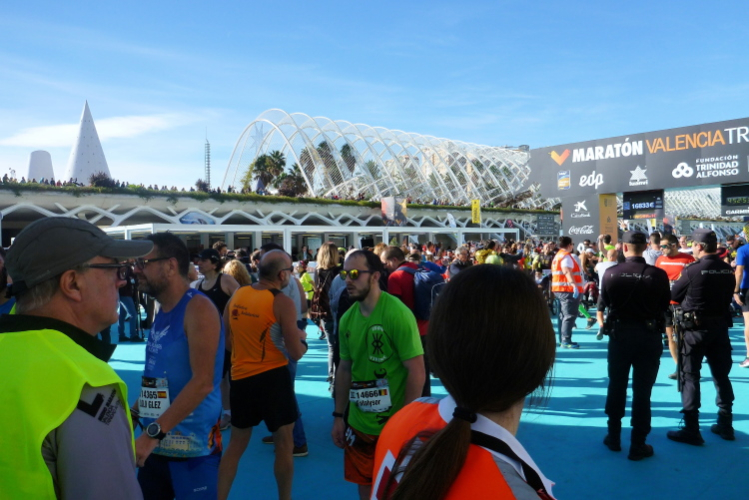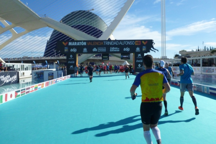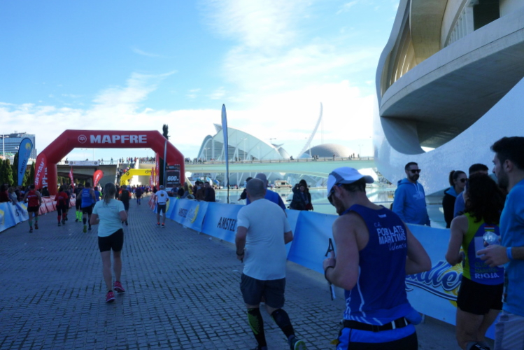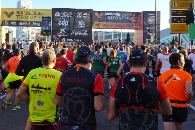 Am meerseitigen Ende des Parks wurde die Ciutat de les Arts i les Ciències, also die Stadt der Künste und Wissenschaften, errichtet. Die neu entstandenen Gebäudekomplexe geben dem Ganzen ein futuristisches Aussehen und werden gerade den Zieleinlauf in einem spektakulären Ambiente stattfinden lassen. Bis dahin müssen wir jedoch erst einmal gestartet sein, was um 08:30 Uhr auf einer breiten Straße unmittelbar am Park beginnt. Ich quatsche noch lange mit José aus dem Hotel und zweien seiner Marathon-Rookies, bis wir gemeinsam nach 20 Minuten im vorletzten von neun Blöcken die Startlinie überschreiten. Wir unterqueren dabei unter lautstarker Anfeuerung den 41 m breiten und 10 m hohen Start“Bogen“ („Einer der weltweit größten!“) und überqueren auf der Pont de Montolivet direkt den Park, zur Linken das prächtige Opernhaus, zur Rechten u.a. das IMAX-Kino. Brücke? Ja, natürlich haben sie beim Umbau des Flußbettes die Brücken stehen lassen. Gerade von unten betrachtet sind das schon geile Aussichten, insbesondere auf den späteren Zielbereich.