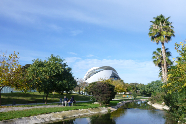 Hübsche Städte, vor allem deren historische Teile, gibt es auf der Welt ja nicht wenige, wie mir meine diversen Laufreisen immer wieder deutlich vor Augen führen. Das Besondere an Valencia, das die Stadt von wirklich allen anderen unterscheidet, ist Folgendes: Bis in die 1970er Jahre führte durch sie mit dem Turia ein respektabler Fluß. Nach einem weiteren katastrophalen Hochwasser 1957 mit zahlreichen Toten in der überfluteten Innenstadt hatte man beschlossen, diesen südlich der Stadt umzuleiten. Zurück blieb die große Rinne. Was damit tun? Glücklicherweise wurde der ursprüngliche Plan, eine Stadtautobahn zu bauen, nicht umgesetzt. Dafür wurde auf 7,5 km Länge mit dem Jardín del Turia weitläufige Gärten und Parks angelegt. Heute gibt es Unmengen von Palmen und Orangenbäumen, außerdem Wasserspiele und sogar Fußballfelder. Daß die Anlagen auch ein innerstädtisches Laufrevier vor dem Herrn darstellen, brauche ich Euch wohl kaum zu erklären.