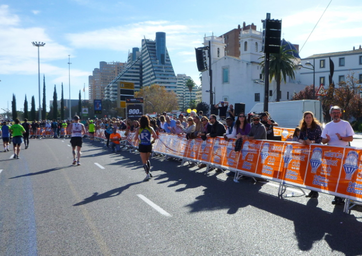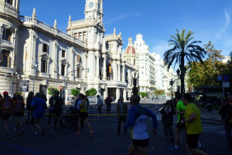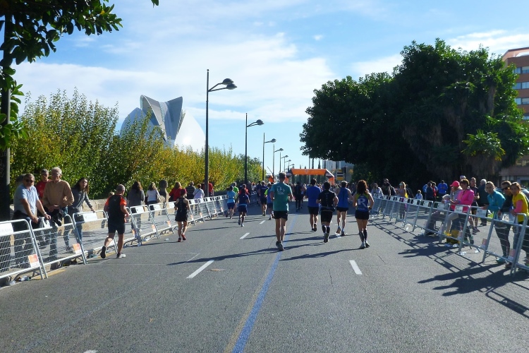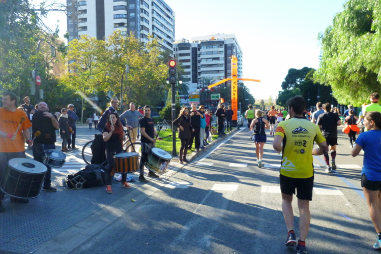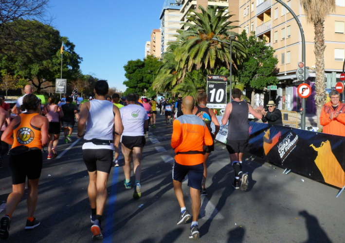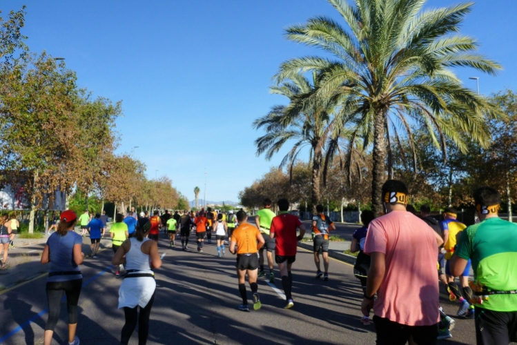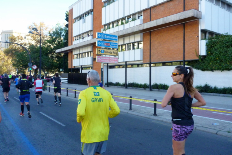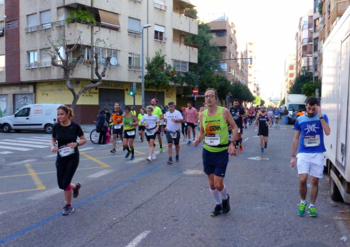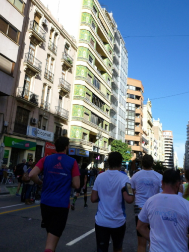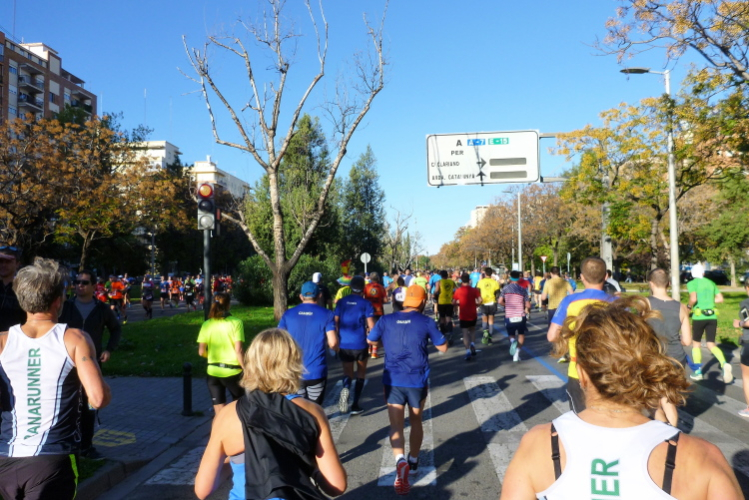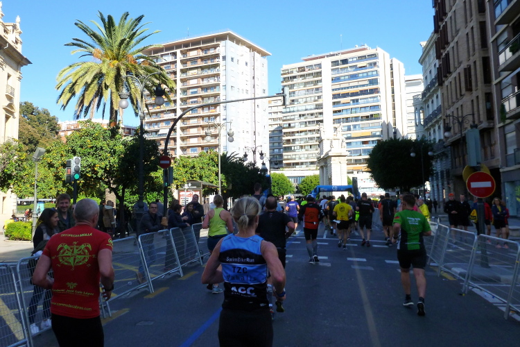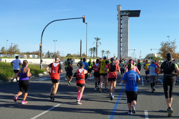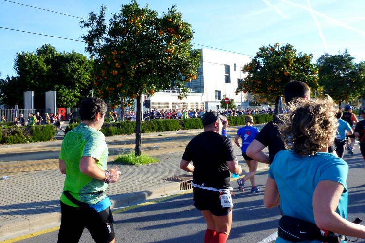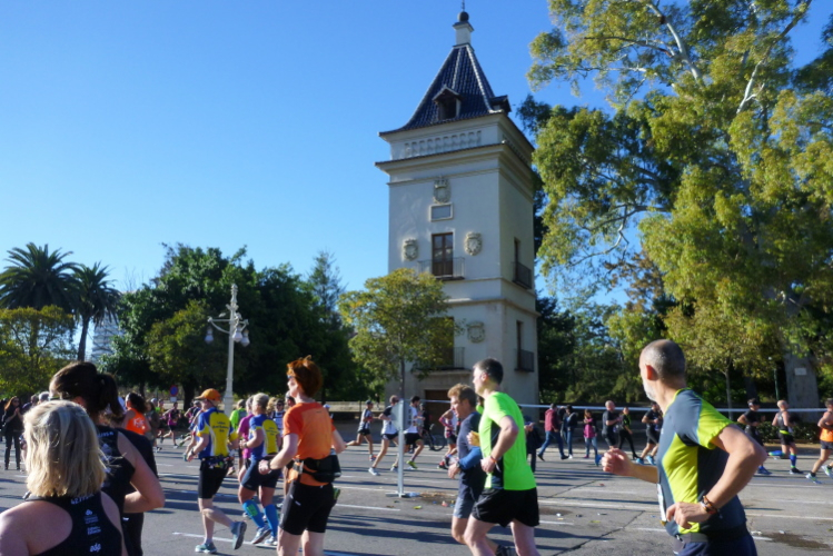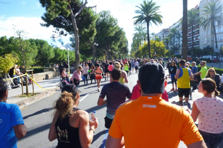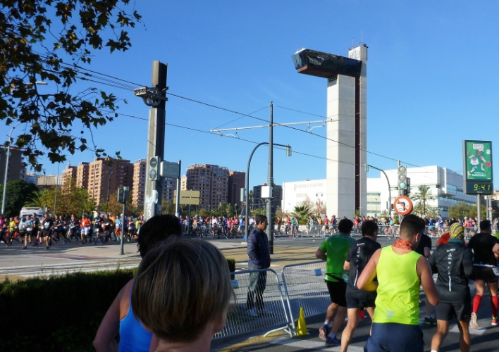 Die nächsten drei km erfolgen als Begegnungsverkehr auf der prächtigen Avenida los Naranjos mit ihren zahlreichen Orangenbäumen, wobei mir einige Sportkameraden sehr unangenehm auffallen, die deutlich vor der Wende beim Torre Miramar (der mich an die Kölner Brückenhäuser erinnert) an km 7 unter hörbarem Protest auf die Gegenseite wechseln. Vermutlich bleibt das jedoch folgenlos, denn eine Zeitkontrolle gibt es dort nicht. Die km 10 und 11 verlaufen auf der nach einem der bekanntesten spanischen Autoren, dem einheimischen Blasco Ibañez benannten, wunderschönen Allee. Aus anderer Richtung wieder am ehemaligen Wendepunkt angekommen, gilt es, auf breiter Straße die spanische Sonne zu genießen. Welch ein Luxus für einen Germanen zu Beginn des Winters!