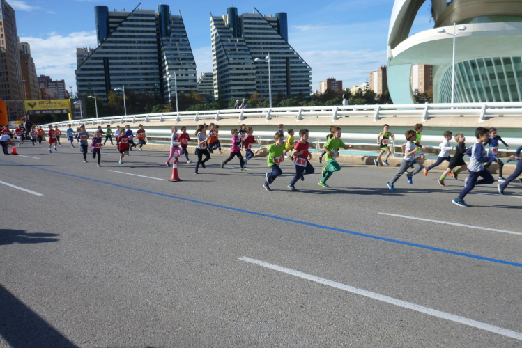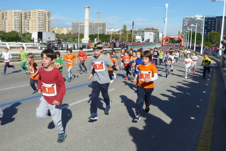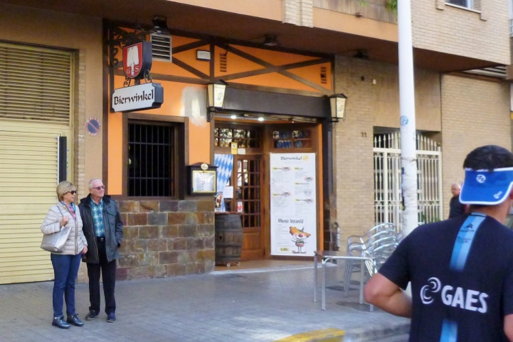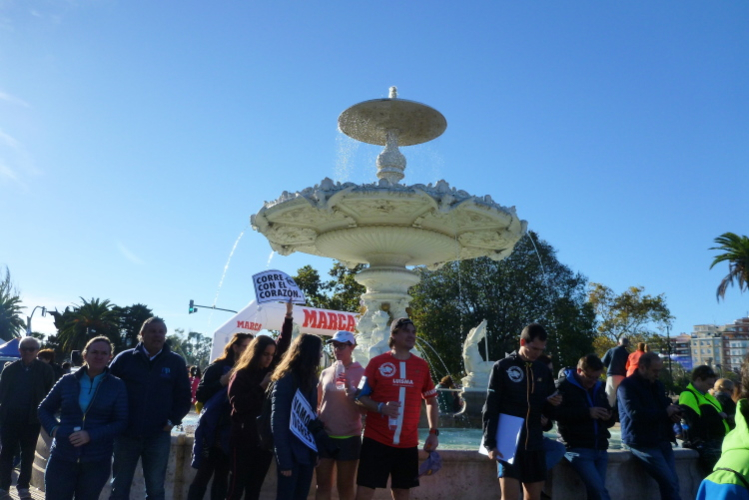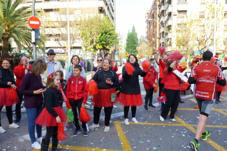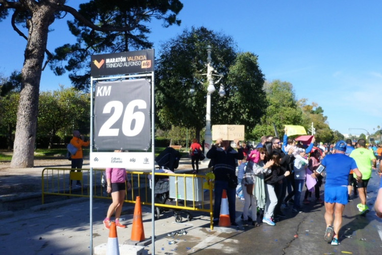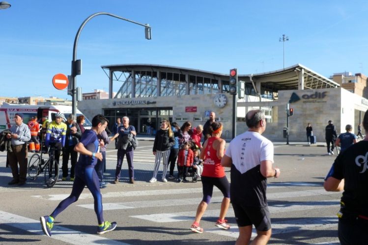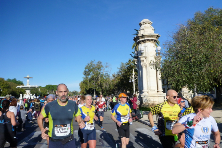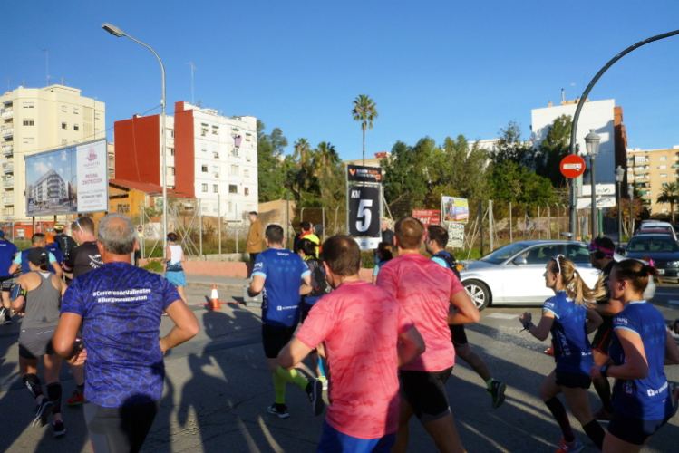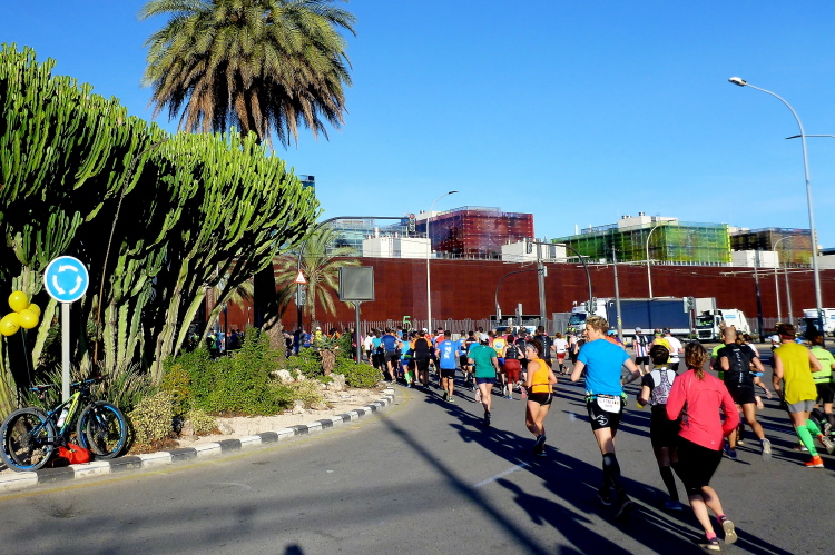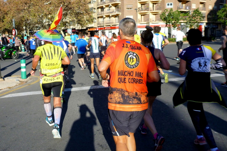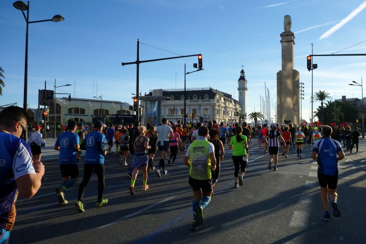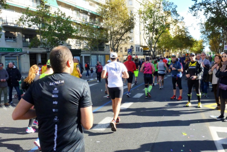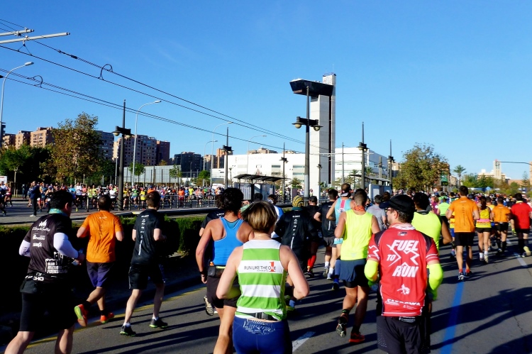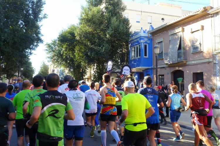 Die nächsten drei km erfolgen als Begegnungsverkehr auf der prächtigen Avenida los Naranjos mit ihren zahlreichen Orangenbäumen, wobei mir einige Sportkameraden sehr unangenehm auffallen, die deutlich vor der Wende beim Torre Miramar (der mich an die Kölner Brückenhäuser erinnert) an km 7 unter hörbarem Protest auf die Gegenseite wechseln. Vermutlich bleibt das jedoch folgenlos, denn eine Zeitkontrolle gibt es dort nicht. Die km 10 und 11 verlaufen auf der nach einem der bekanntesten spanischen Autoren, dem einheimischen Blasco Ibañez benannten, wunderschönen Allee. Aus anderer Richtung wieder am ehemaligen Wendepunkt angekommen, gilt es, auf breiter Straße die spanische Sonne zu genießen. Welch ein Luxus für einen Germanen zu Beginn des Winters!