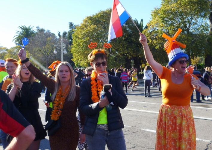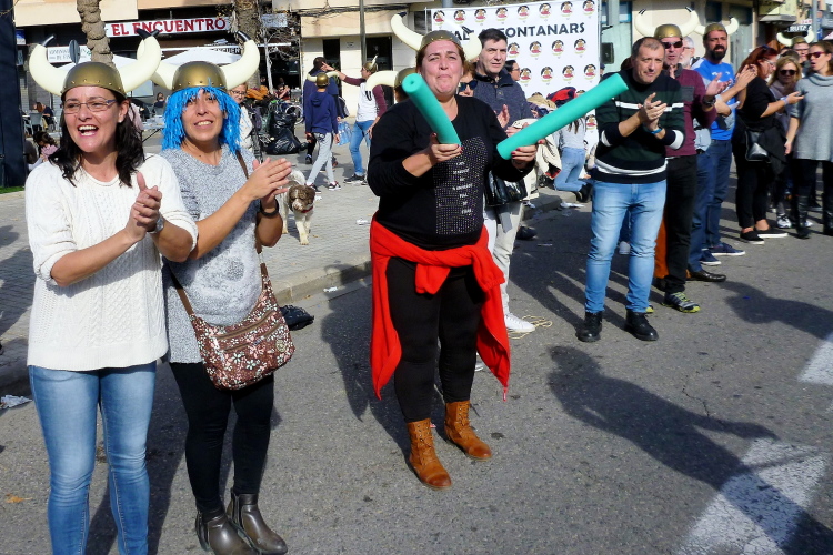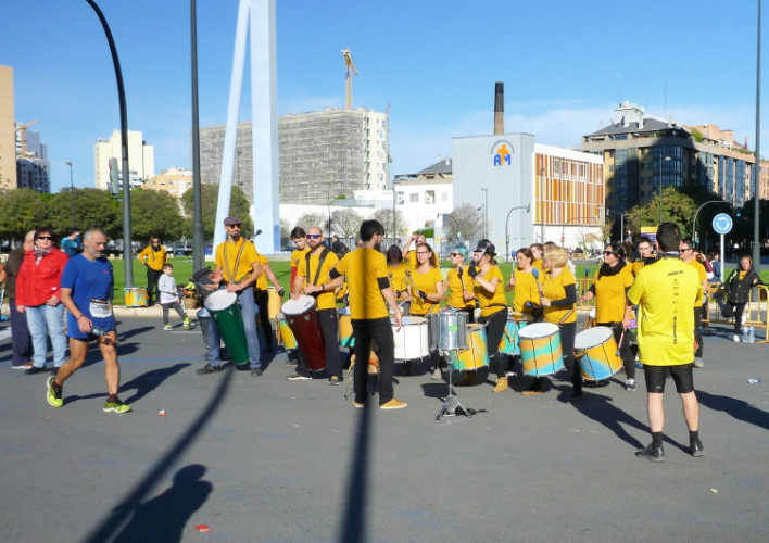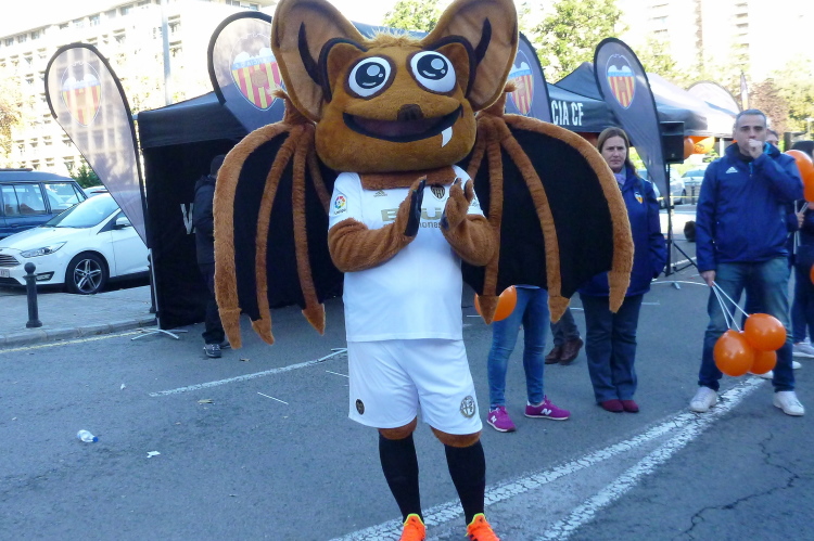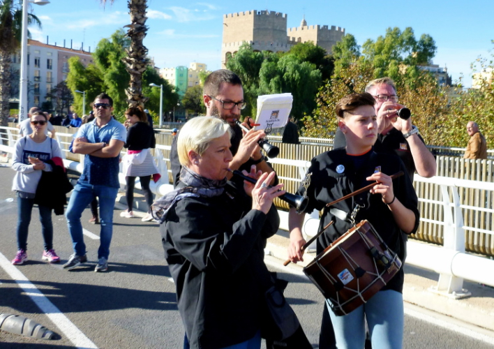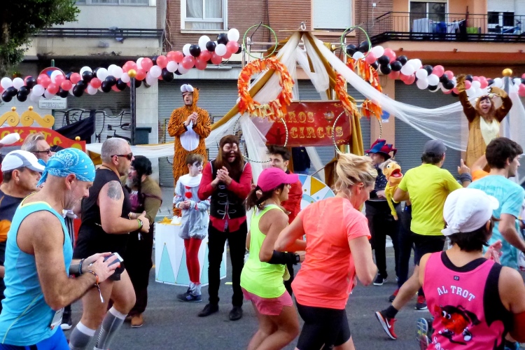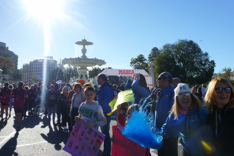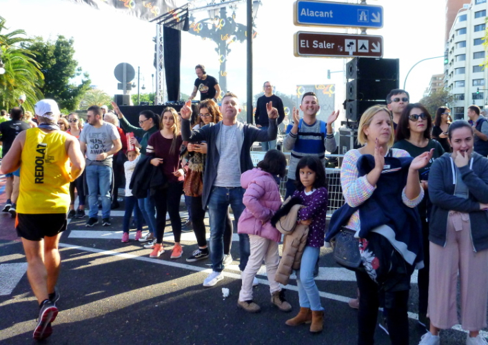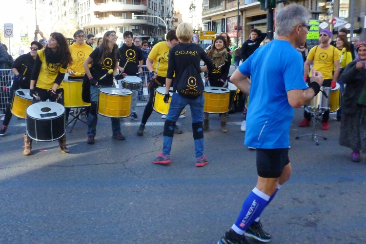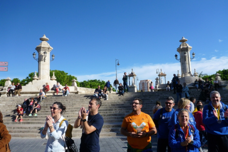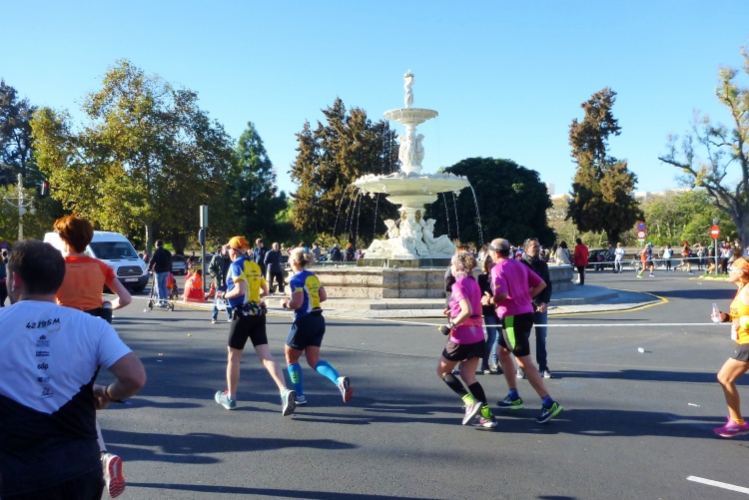 Immer wieder werden wir von verschiedenen Musikgruppen, häufig Trommlergruppen, angefeuert. An die 200 „Äcktschen Poinz“, wie es so unschön auf Neudeutsch heißt, hat man uns versprochen. Mitten im zu umrundenden Kreisverkehr bei km 13,5 sprudelt ein höchst attraktiver Brunnen, den man fast schon mal zur Abkühlung hätte ansteuern sollen. Schöne historische Türmchen beidseits der Straße markieren den ersten Kontakt mit dem ehemaligen Flußbett des Turia, dem wir einen km folgen. Diese Ecke ist natürlich, da Innenstadtbereich, besonders publikumsintensiv. Klasse, wie sich hier die Fans aus über 90 Nationen in nicht selten landestypischen Kostümen engagieren. Nur an den ganz oben sichtbaren Tribünen erkenne ich das 55.000 Zuschauer fassende Stadion Mestalla des FC Valencia. Seine Fans sind berüchtigt, ihr Schlachtruf „Que bote Mestalla! (Laßt das Mestalla beben!“) ist legendär. Eigentlich sollten die hier schon seit 2010 nicht mehr spielen, aber aufgrund verschiedener, natürlich auch finanzieller Probleme, wird das neue Stadion („Nou Mestalla“) erst 2021 fertig werden.