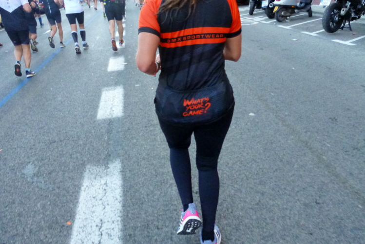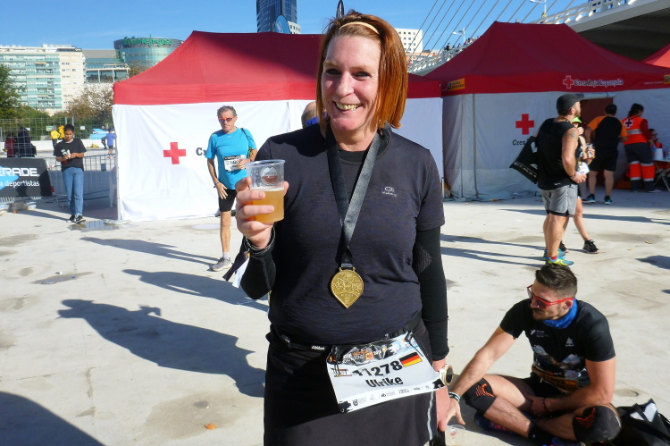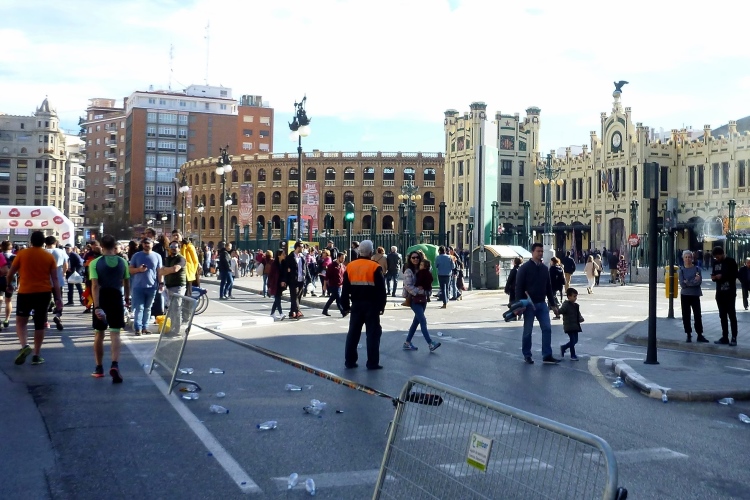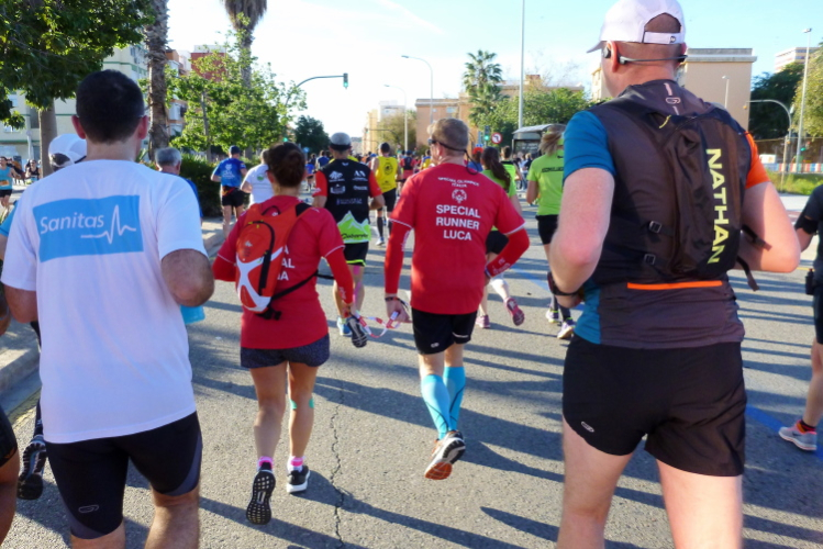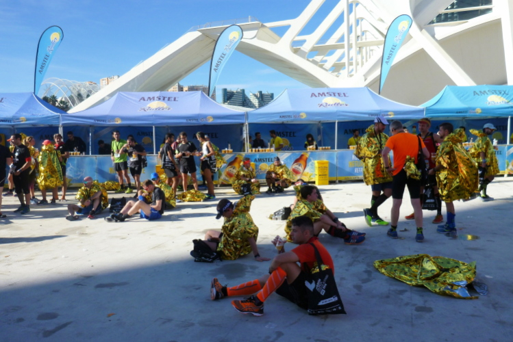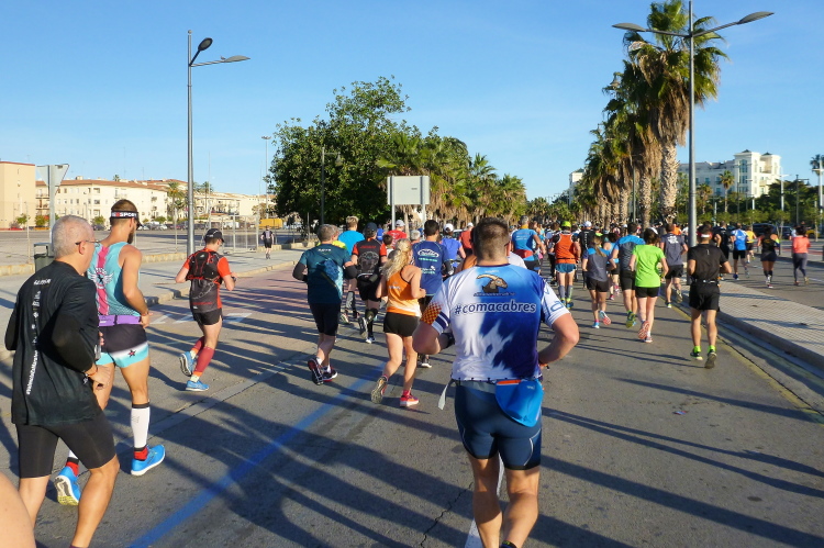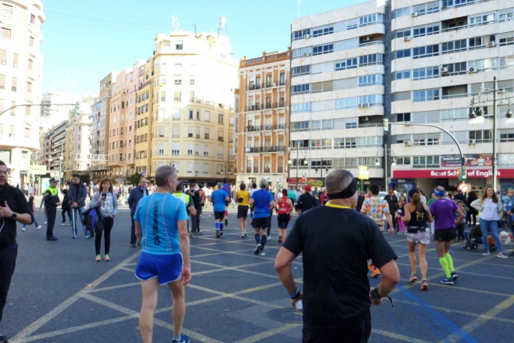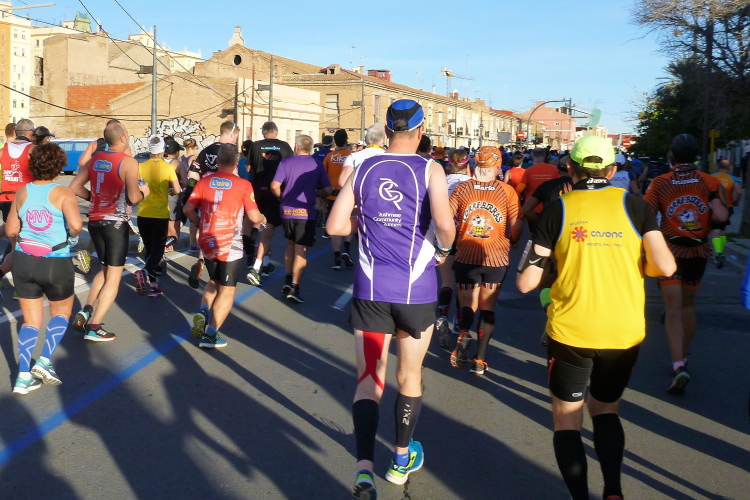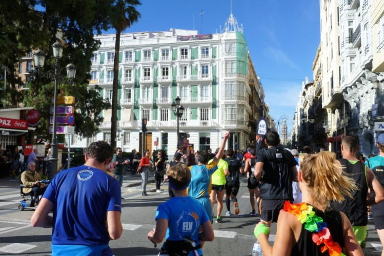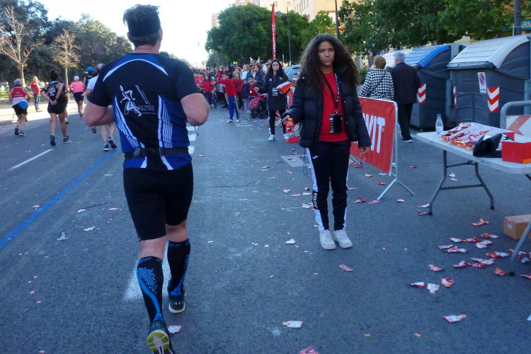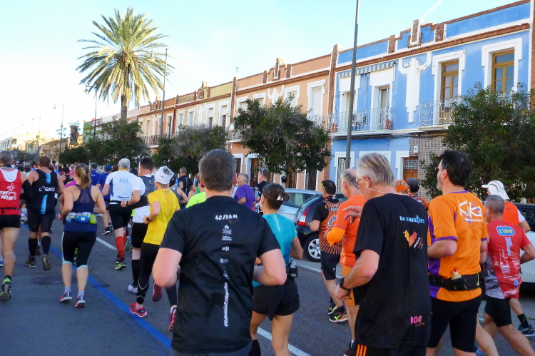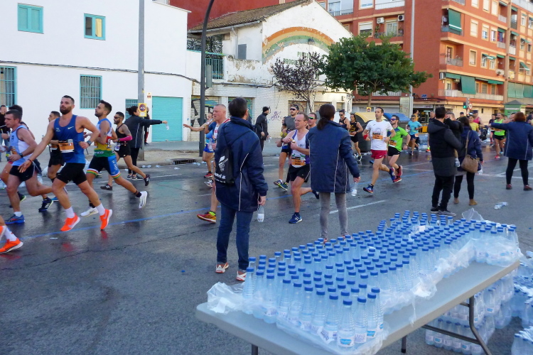 Nach guten anderthalb weiteren km parallel zum riesigen Stadtstrand, den wir leider nur kurz durch einige Baulücken erahnen können, biegen wir wieder in Richtung Innenstadt ein. Sehr schön sind die erhaltenen zweistöckigen Bürgerhäuser in Reihenbauweise, deren interessante Farbgestaltung das alte Valencia erahnen lassen. Nach fünf Kilometern sind 35 Minuten vergangen, das dichte Teilnehmerfeld und die Fotostops fordern eben ihren Tribut. Der erste VP ist, wie allen weiter folgenden ebenfalls, beidseitig aufgebaut und sehr lang. Schon hier gibt’s zusätzlich zum Wasser in Flaschen Iso (Gatorade), wahlweise im Becher oder ebenfalls in Flaschen. Trinken ist heute wieder einmal höchste Bürgerpflicht, denn wir erwarten und bekommen gegen Mittag wolkenlose 20 Grad, es ist ein Traum.
