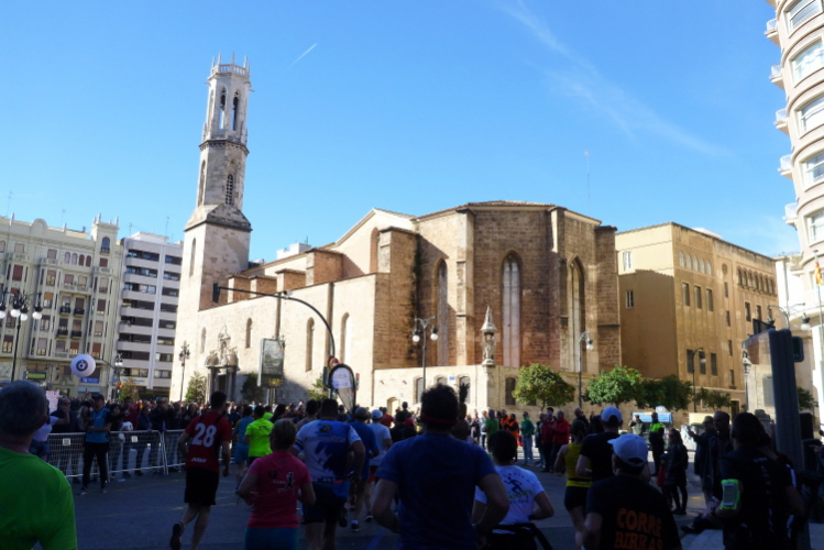 Von den meisten Nichteinheimischen leider unbemerkt geblieben dürfte unmittelbar nach der Brücke rechts die Torres de Serranos, ein prächtiges ehemaliges Stadttor, geblieben sein. Kurz darauf ist die blaugekachelte Kuppel eines ehemaligen Klosters ein echter Hingucker. Ein wunderschönes Gebäude jagt das nächste: Der Glockenturm der Santa Catarina, das alte Lagerhaus, der Platz der Königin, in deren Hintergrund die Kathedrale, der Rathausplatz und was weiß ich noch alles. Super! Vor allen Dingen auch, daß km 30 in 3:08 Std. spurlos an mir vorübergegangen ist. Was mich aber nicht daran hindert, bei der Gelausgabe erneut zuzugreifen. Nach 31,5 km geht’s wieder über den nicht mehr vorhandenen Turia, wieder erfreue ich mich an einem Teilstück des gleichnamigen Parks.