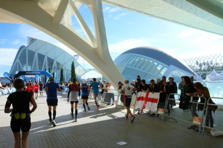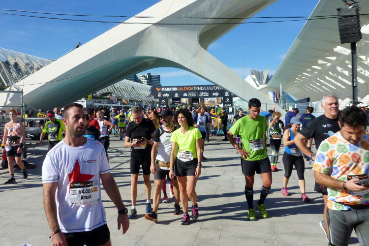 Für nicht Wenige wird’s jetzt echt haarig und ich mache drei Kreuzzeichen, dass ich, von den üblichen Wehwehchen mal abgesehen, keinerlei Probleme habe. Das Erreichen des km 41 ist gleichbedeutend mit dem Wiedersehen der Brückenmonster der Puente del Reino, nur diesmal von deren anderen Seite. Dann wird’s richtig geil, denn die futuristischen Bauten der Stadt der Kunst und Wissenschaften sind voraus und damit die restliche Meterzahl nur mehr dreistellig.