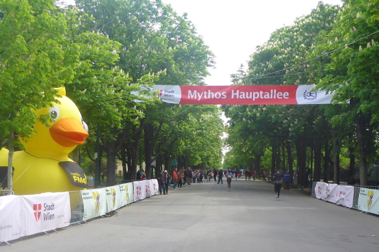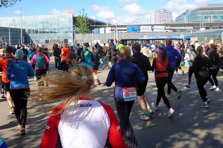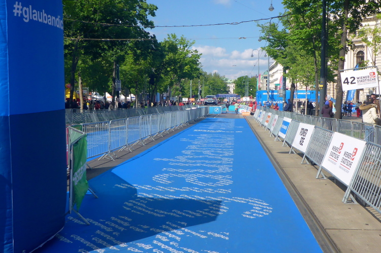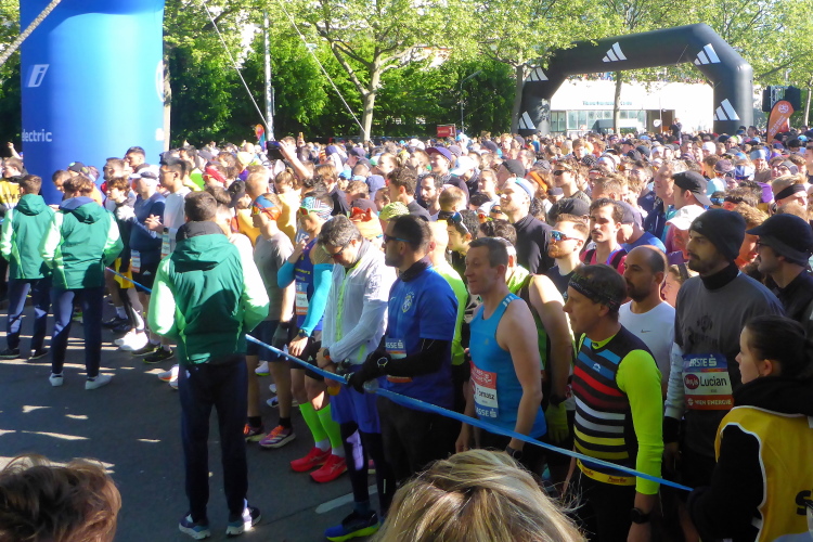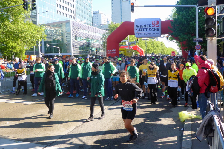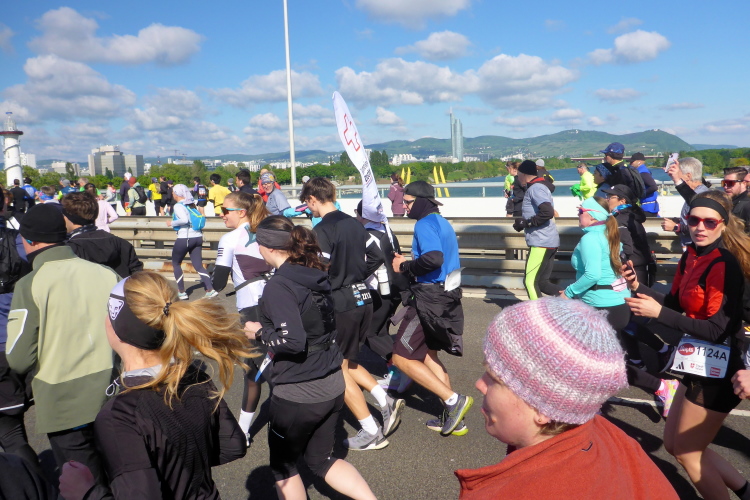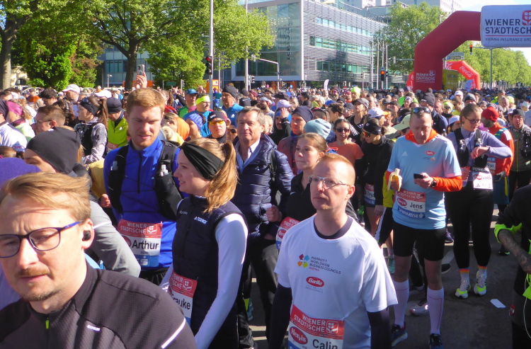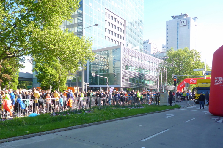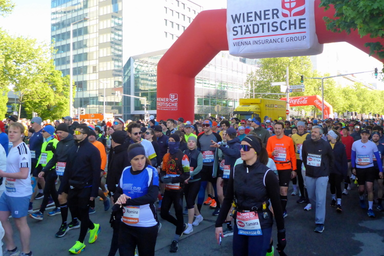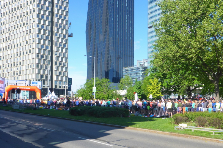 Die Startaustellung erfolgt in der Donau-City auf einer sechsspurigen Straße am Fuße des Donau-City-Towers 1. Mit 60 Etagen und 220m Höhe ist er das höchste Gebäude Wiens und Österreichs. Er wird nur um 2 m überragt vom 1 km entfernt stehenden Donauturm, welcher als Fernsehturm das höchste Bauwerk sein darf, aber eben nicht als Gebäude eingestuft wird. Eingeteilt in 6 Startblöcke geht der erste pünktlich um 9 Uhr auf die 42,195 km. Es läuft gut, die geplanten 5 Minuten Abstand von Block zu Block werden verkürzt und mein 6. Block startet 5 Minuten eher bereits um 9:20 Uhr.