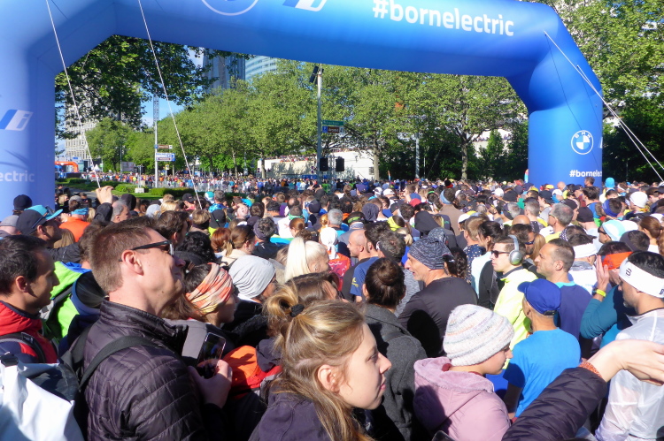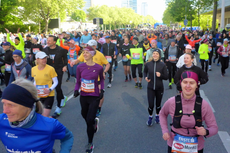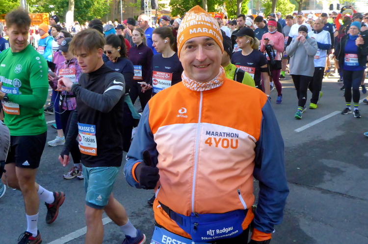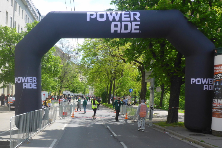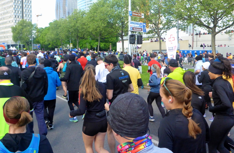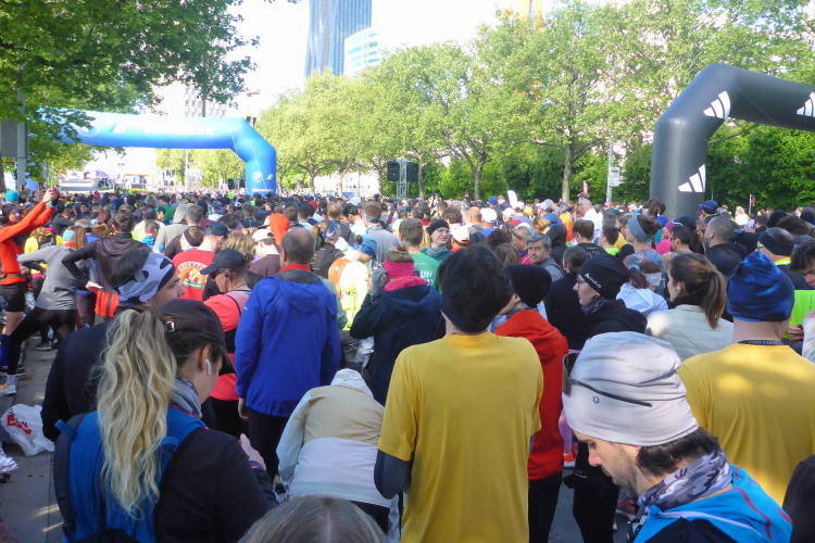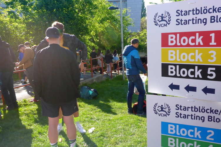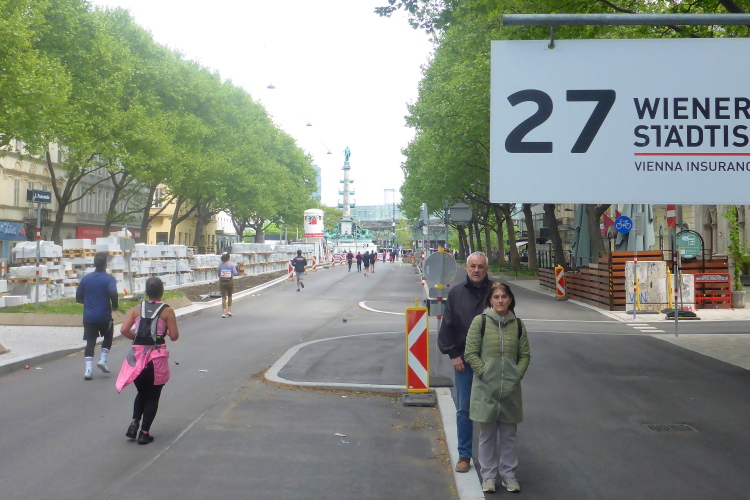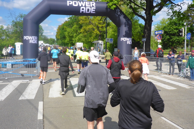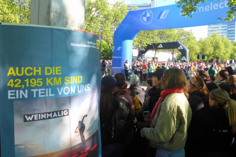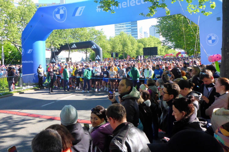 Die Startaustellung erfolgt in der Donau-City auf einer sechsspurigen Straße am Fuße des Donau-City-Towers 1. Mit 60 Etagen und 220m Höhe ist er das höchste Gebäude Wiens und Österreichs. Er wird nur um 2 m überragt vom 1 km entfernt stehenden Donauturm, welcher als Fernsehturm das höchste Bauwerk sein darf, aber eben nicht als Gebäude eingestuft wird. Eingeteilt in 6 Startblöcke geht der erste pünktlich um 9 Uhr auf die 42,195 km. Es läuft gut, die geplanten 5 Minuten Abstand von Block zu Block werden verkürzt und mein 6. Block startet 5 Minuten eher bereits um 9:20 Uhr.