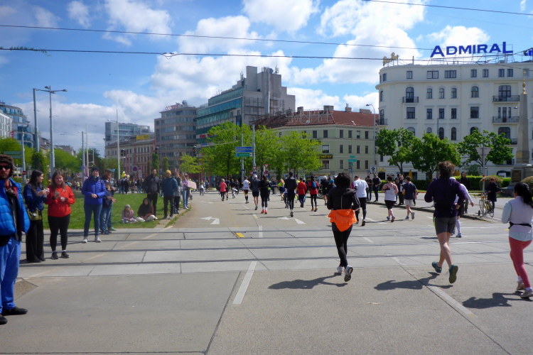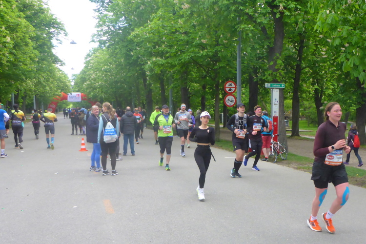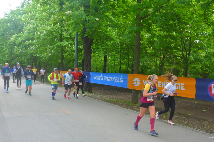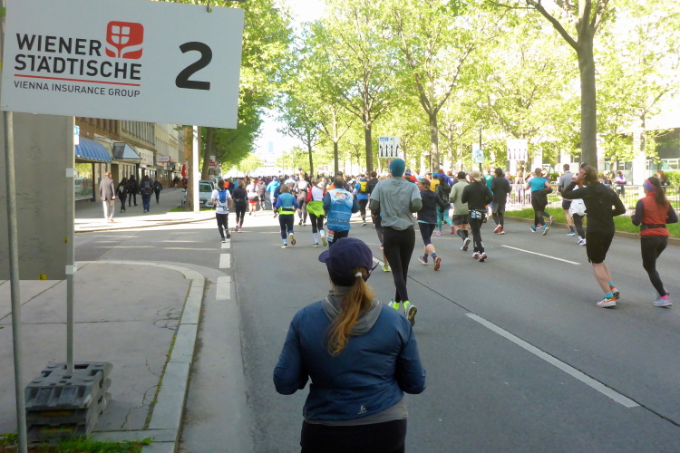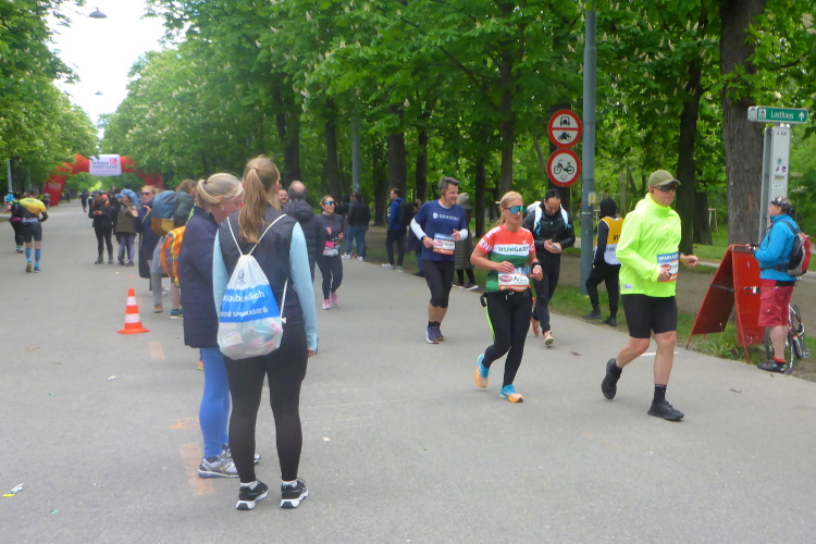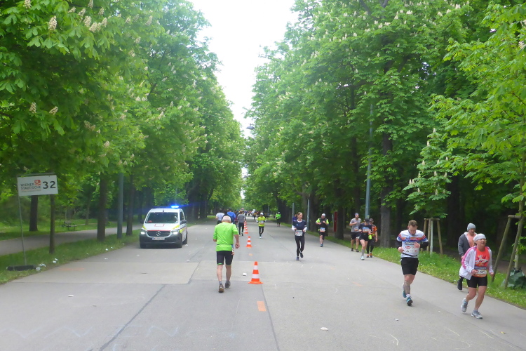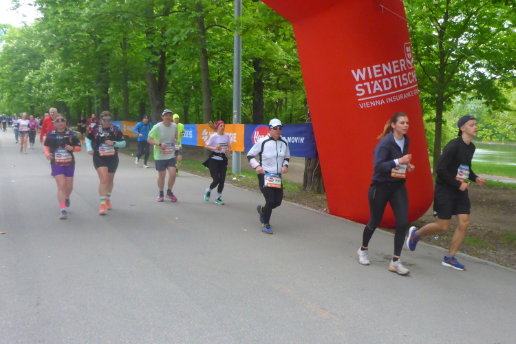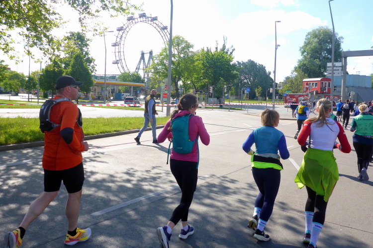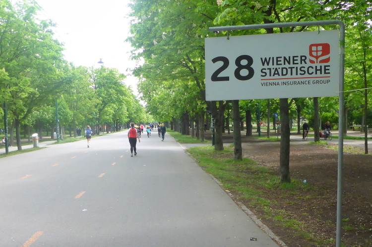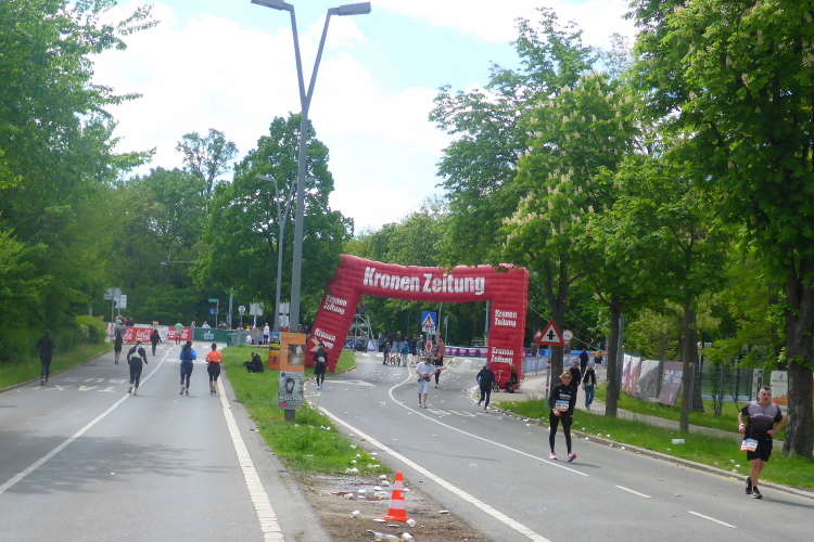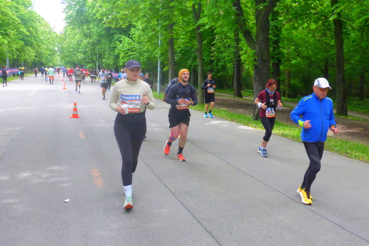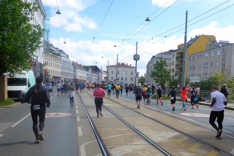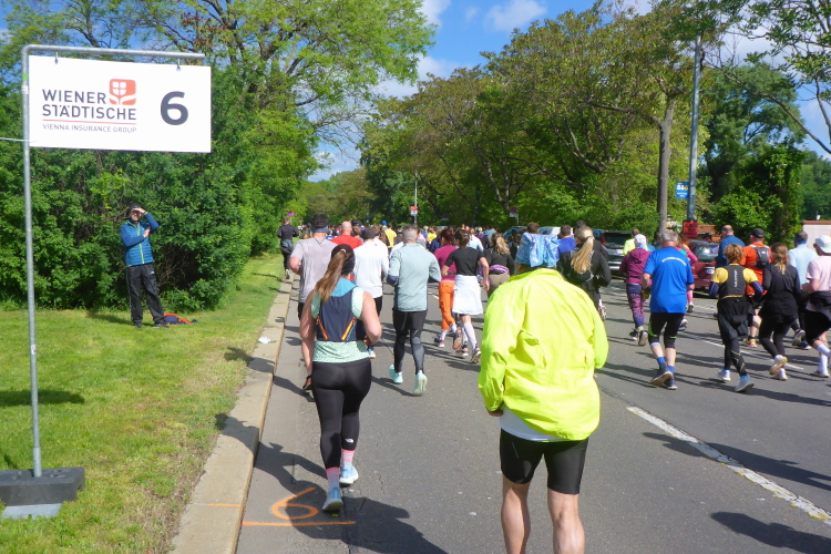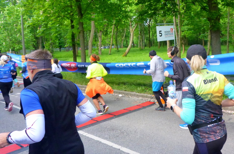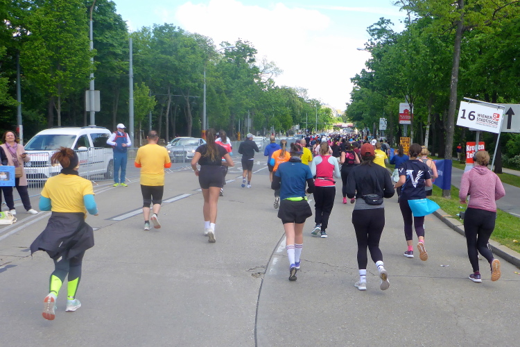 Der erste Verpflegungspunkt ist erreicht und bei der Masse an Läufern auch das erwartete Chaos. Ich laufe schnell durch, die kühlen Temperaturen gestatten es mir, einmal auszulassen. Neben 8 regulären VPs sind noch 15 Wasserstellen angekündigt, das sollte reichen und ist eine dichtere Versorgung als bei manchen Hitzeläufen im Sommer. Wir verlassen den Prater und laufen an dessen Rand wieder stadteinwärts. Inzwischen hat sich das Feld sortiert und die Geschwindigkeiten passen. Die Kilometer ziehen vorbei und ab und zu strahlt die Sonne vom Himmel.