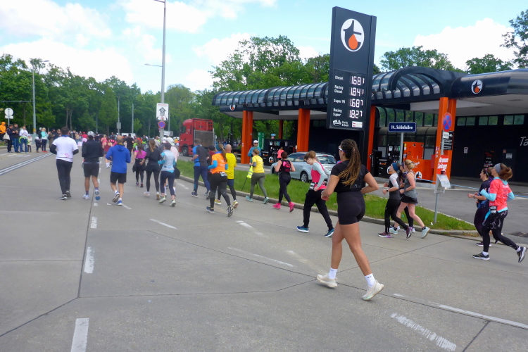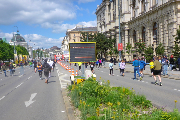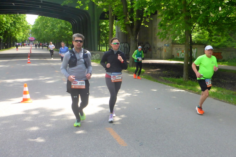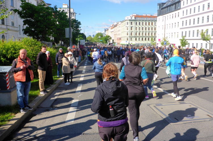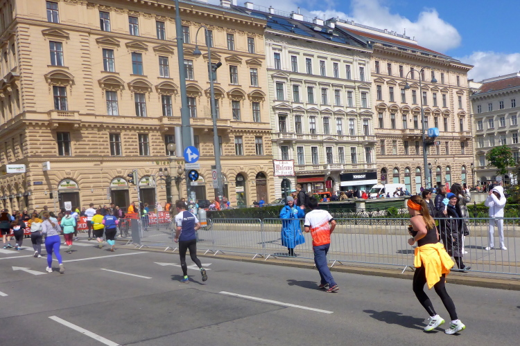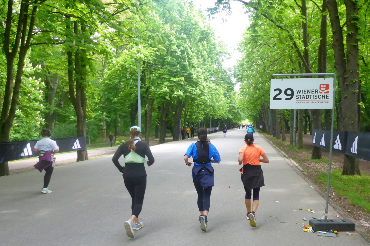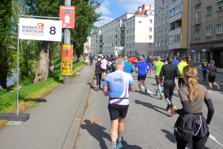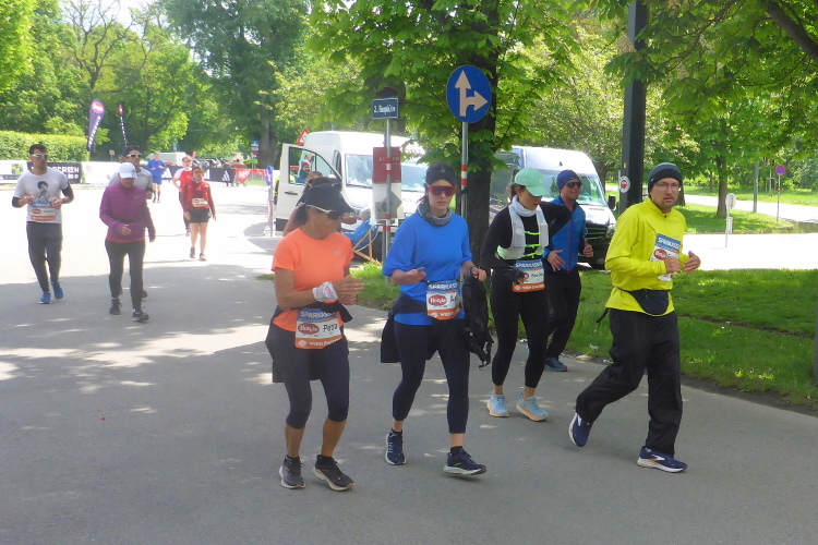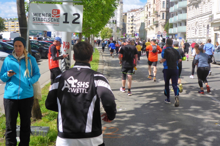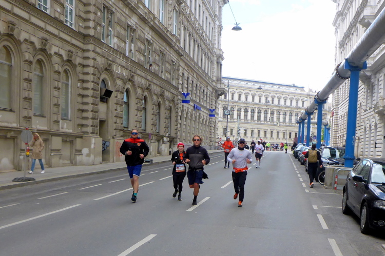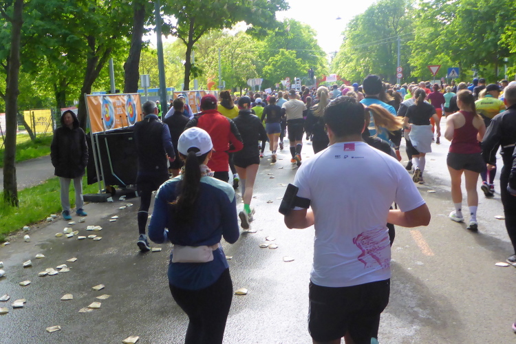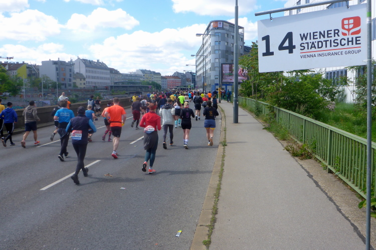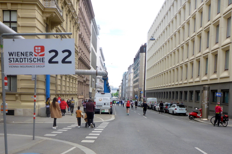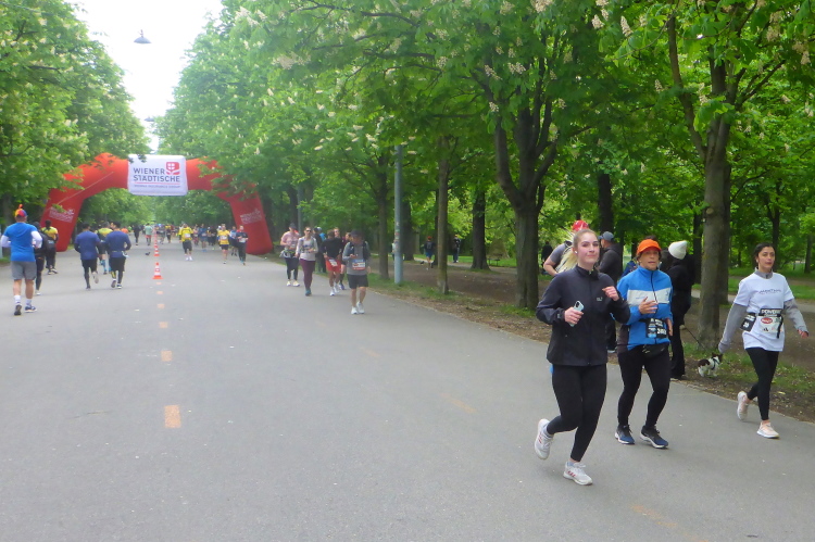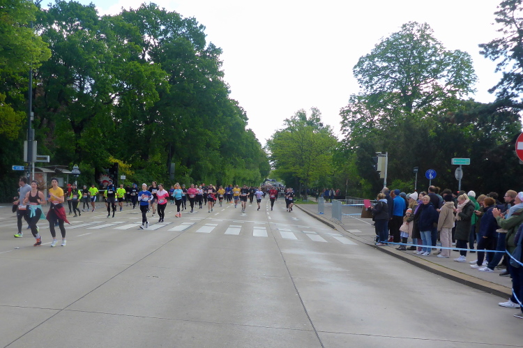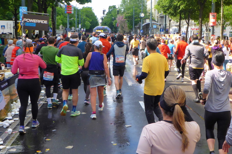 Der erste Verpflegungspunkt ist erreicht und bei der Masse an Läufern auch das erwartete Chaos. Ich laufe schnell durch, die kühlen Temperaturen gestatten es mir, einmal auszulassen. Neben 8 regulären VPs sind noch 15 Wasserstellen angekündigt, das sollte reichen und ist eine dichtere Versorgung als bei manchen Hitzeläufen im Sommer. Wir verlassen den Prater und laufen an dessen Rand wieder stadteinwärts. Inzwischen hat sich das Feld sortiert und die Geschwindigkeiten passen. Die Kilometer ziehen vorbei und ab und zu strahlt die Sonne vom Himmel.