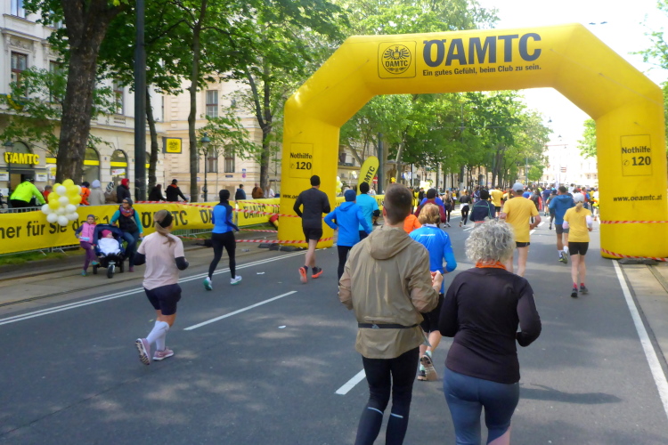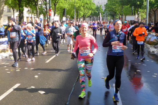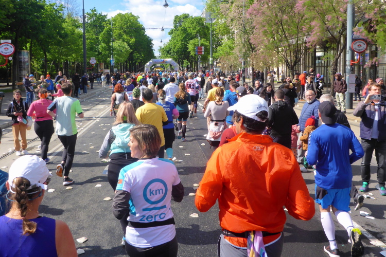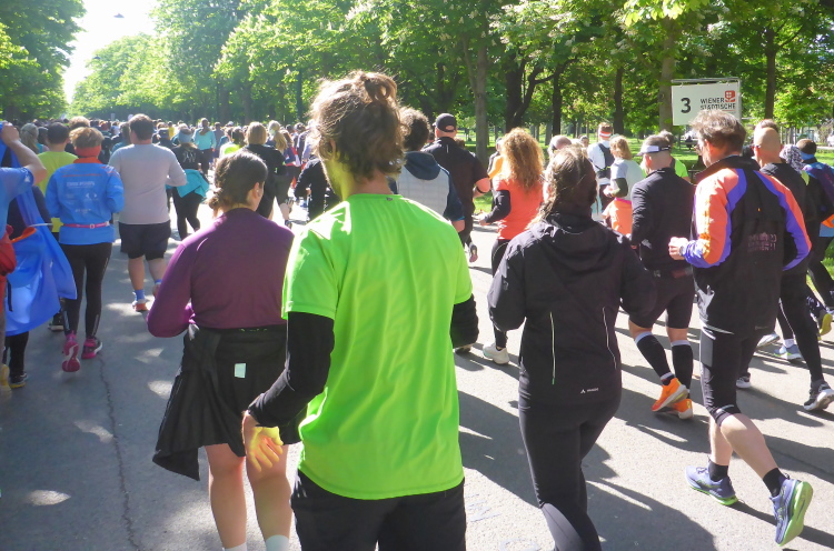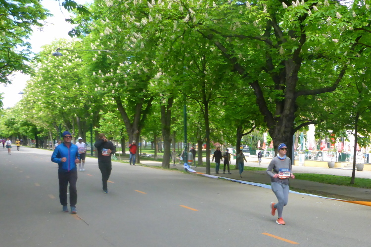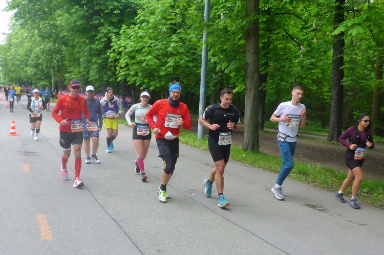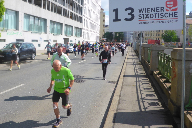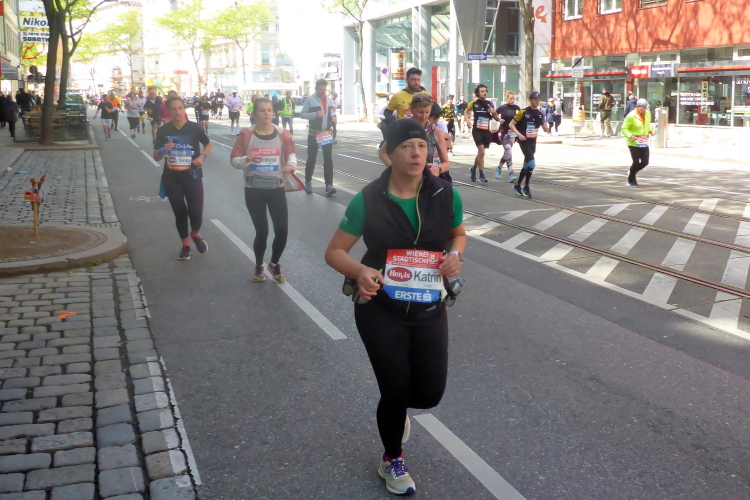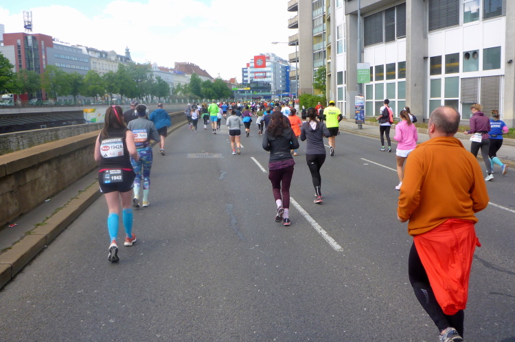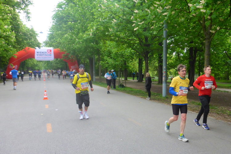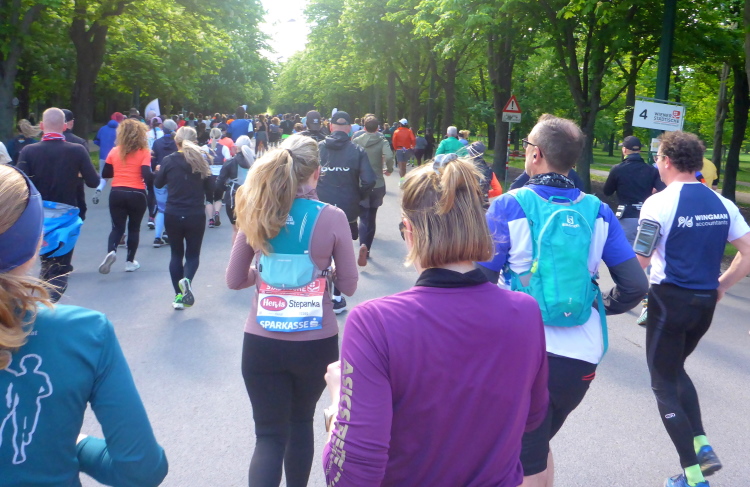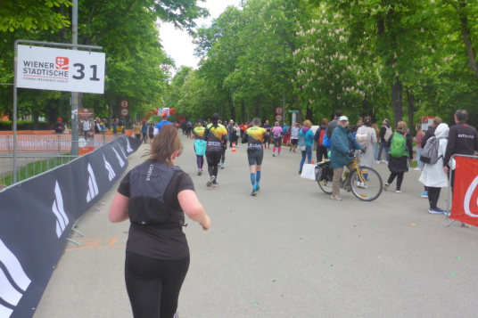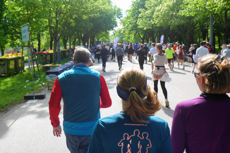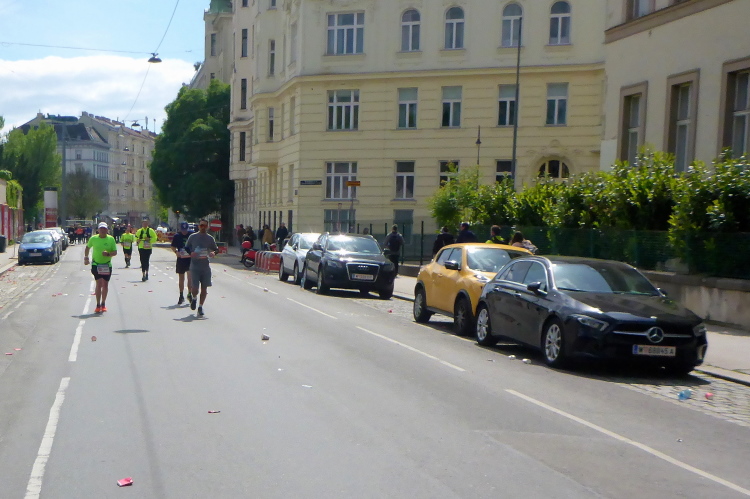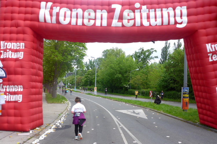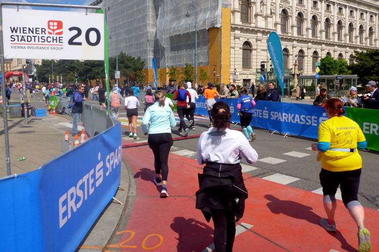 Der erste Verpflegungspunkt ist erreicht und bei der Masse an Läufern auch das erwartete Chaos. Ich laufe schnell durch, die kühlen Temperaturen gestatten es mir, einmal auszulassen. Neben 8 regulären VPs sind noch 15 Wasserstellen angekündigt, das sollte reichen und ist eine dichtere Versorgung als bei manchen Hitzeläufen im Sommer. Wir verlassen den Prater und laufen an dessen Rand wieder stadteinwärts. Inzwischen hat sich das Feld sortiert und die Geschwindigkeiten passen. Die Kilometer ziehen vorbei und ab und zu strahlt die Sonne vom Himmel.