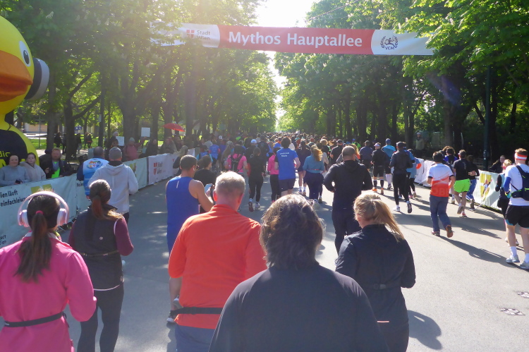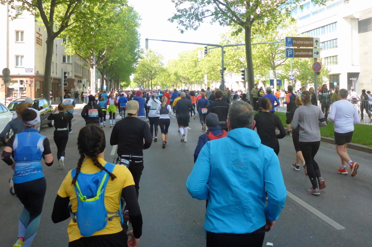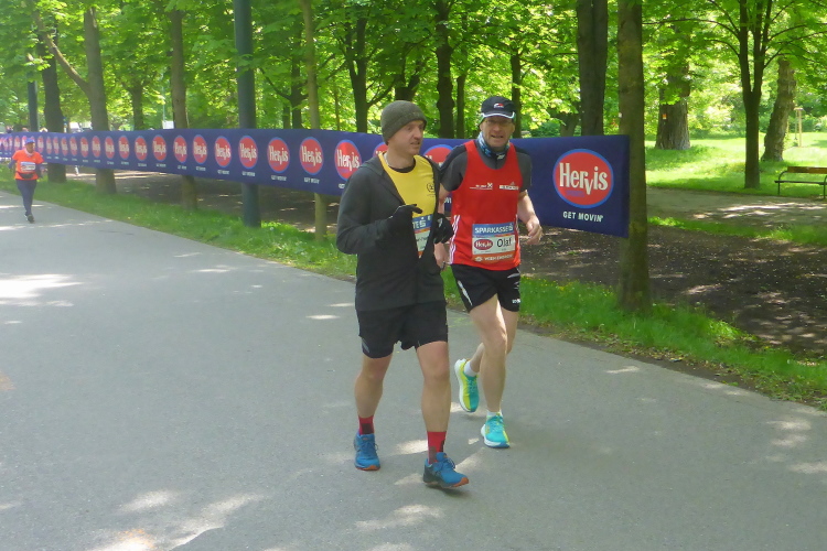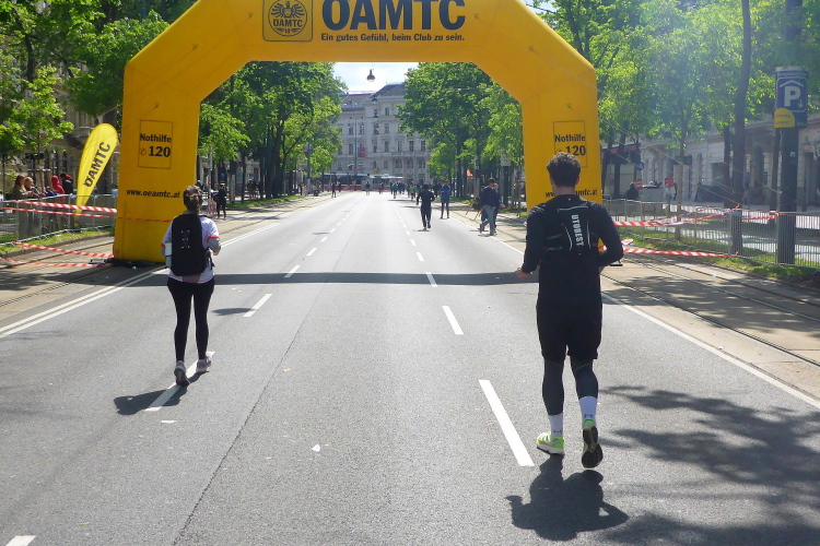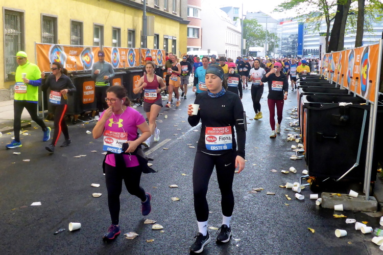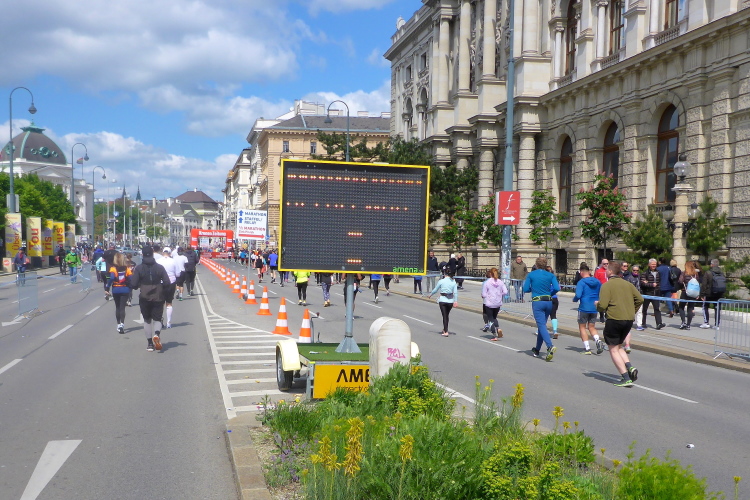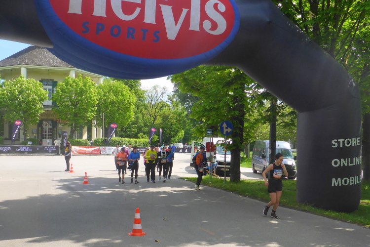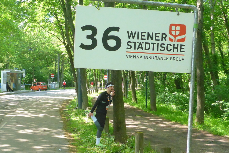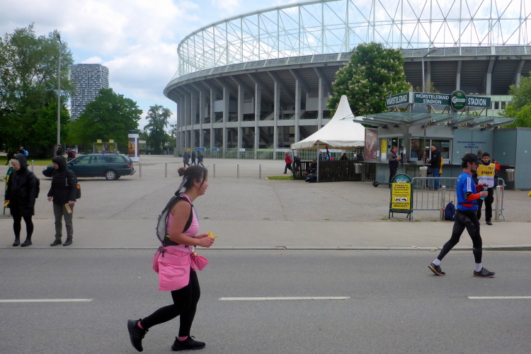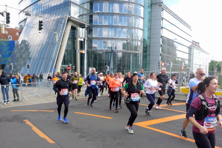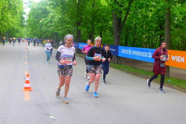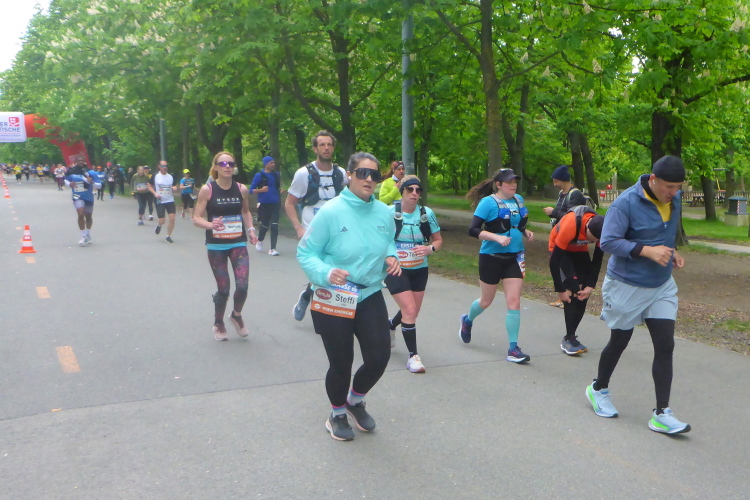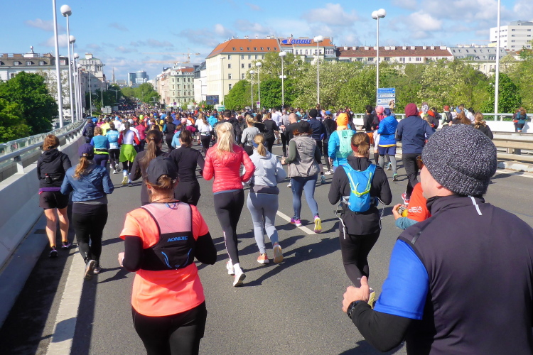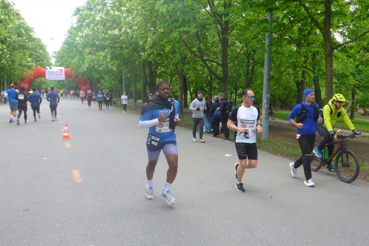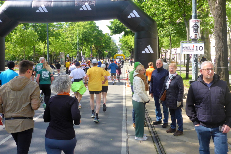 Der erste Verpflegungspunkt ist erreicht und bei der Masse an Läufern auch das erwartete Chaos. Ich laufe schnell durch, die kühlen Temperaturen gestatten es mir, einmal auszulassen. Neben 8 regulären VPs sind noch 15 Wasserstellen angekündigt, das sollte reichen und ist eine dichtere Versorgung als bei manchen Hitzeläufen im Sommer. Wir verlassen den Prater und laufen an dessen Rand wieder stadteinwärts. Inzwischen hat sich das Feld sortiert und die Geschwindigkeiten passen. Die Kilometer ziehen vorbei und ab und zu strahlt die Sonne vom Himmel.