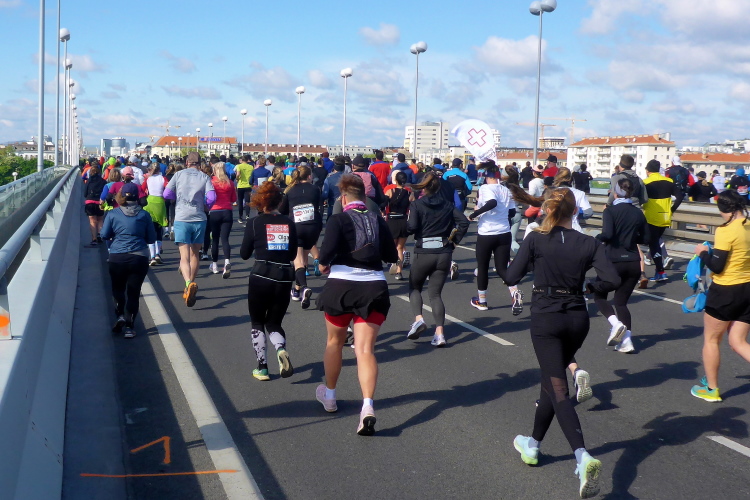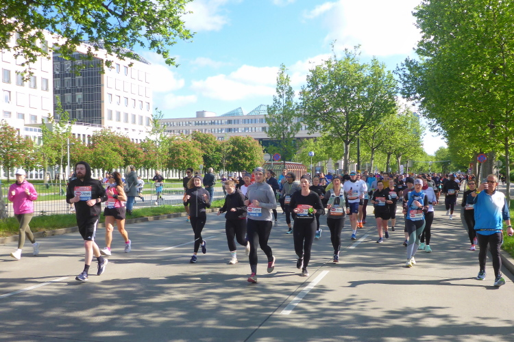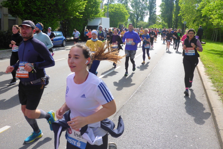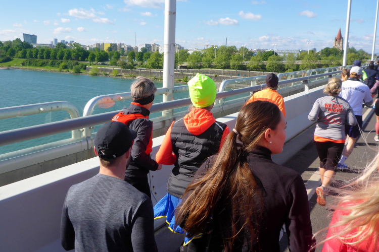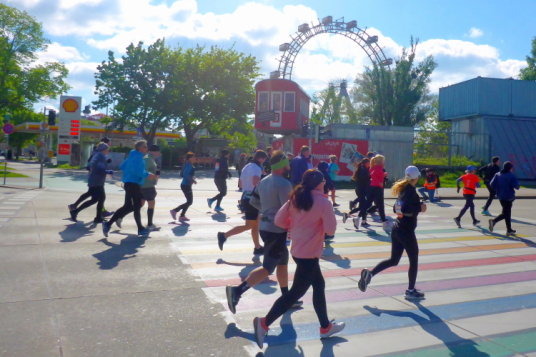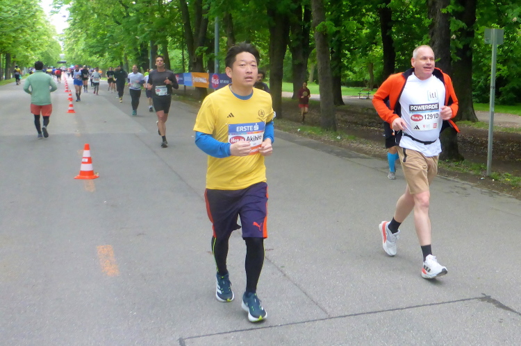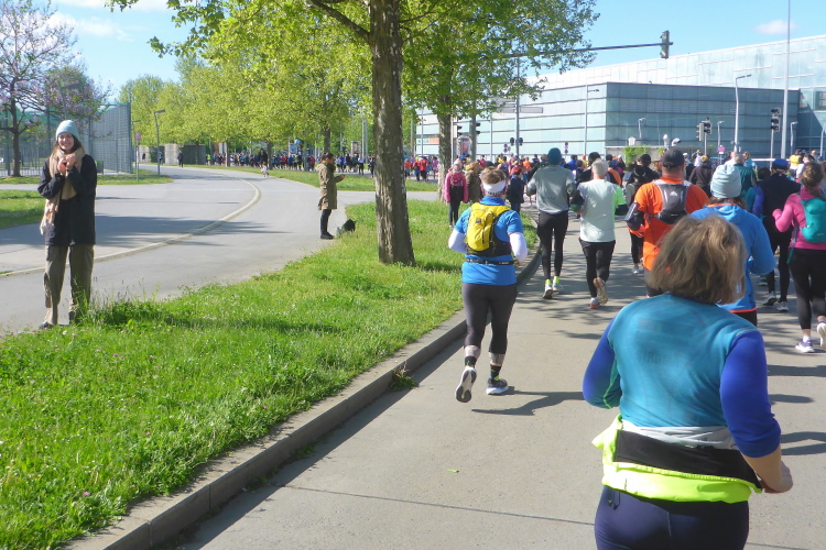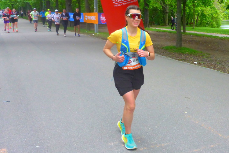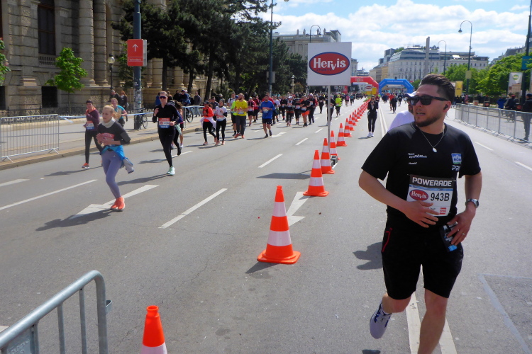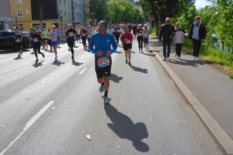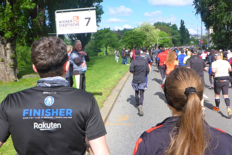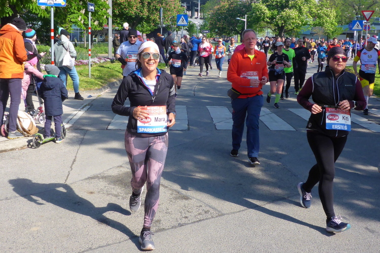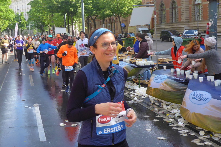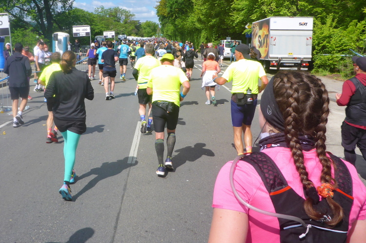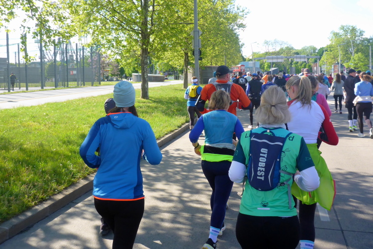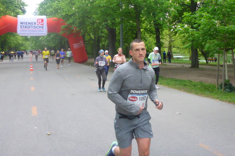 Der erste Verpflegungspunkt ist erreicht und bei der Masse an Läufern auch das erwartete Chaos. Ich laufe schnell durch, die kühlen Temperaturen gestatten es mir, einmal auszulassen. Neben 8 regulären VPs sind noch 15 Wasserstellen angekündigt, das sollte reichen und ist eine dichtere Versorgung als bei manchen Hitzeläufen im Sommer. Wir verlassen den Prater und laufen an dessen Rand wieder stadteinwärts. Inzwischen hat sich das Feld sortiert und die Geschwindigkeiten passen. Die Kilometer ziehen vorbei und ab und zu strahlt die Sonne vom Himmel.