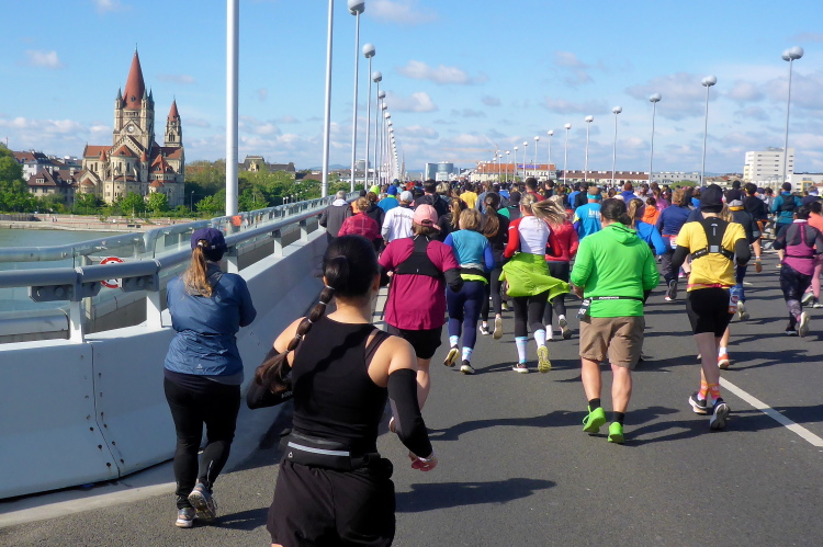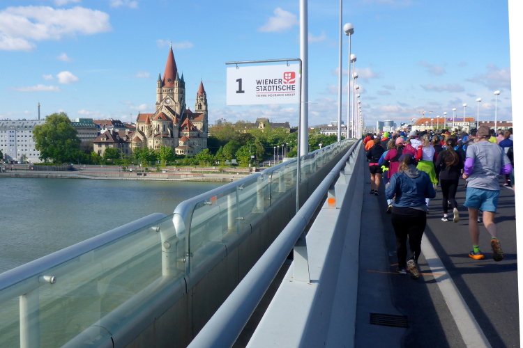Der erste Kilometer steigt leicht an und mit der Reichsbrücke queren wir über die Donau und Donauinsel, wir verlassen den 22. Bezirk. Auf der westlichen Donauseite passieren wir die auffällige 1913 unter den Augen von Kaiser Franz Josef I geweihte Franz-von-Assisi Kirche, dessen Grundstein auch in des Kaisers Anwesenheit bereits 1900 gelegt wurde. Gut Ding braucht Weile denke ich mir, passt zu meinem Fitnesslevel für den heutigen Marathon.