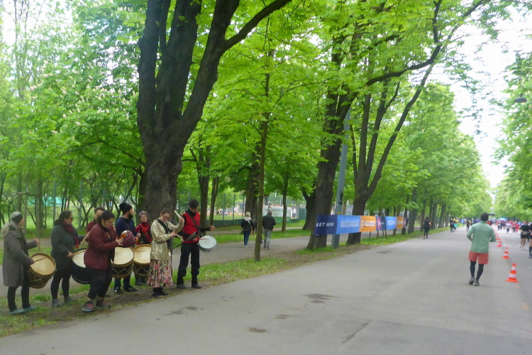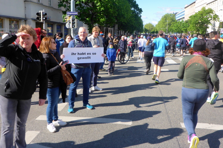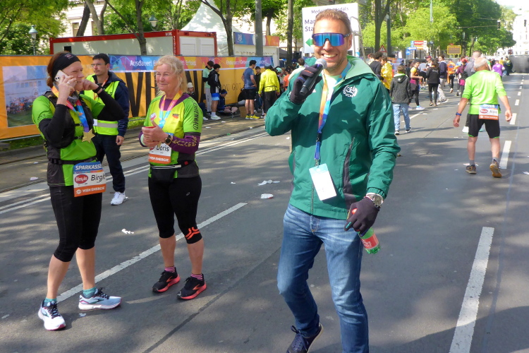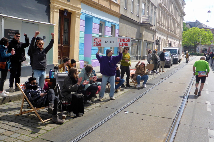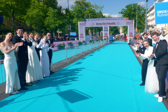 Die letzten 500m sind mit Schildern pro 100m angezeigt. Es ist zwar schon ruhig so spät im Rennen, aber die verbliebenden Zuschauer feuern noch kräftig an. Kurz vorm Ziel stehen die Walzertänzer Spalier, ich hebe die Kamera und das Display erlischt. Also stehe ich 100 m vorm Ziel und fummel an meiner Kamera rum um den leeren Akku zu tauschen. Sekundenlang spüre und sehe ich die ungläubigen Blicke der Tänzer und Zuschauer: „Was macht der da?“ Dann ist der Akku drin, und die Walzertänzer jubeln mich ins Ziel, da sie registrieren, dass mir das Foto von ihnen wichtiger ist, als ein paar Sekunden schneller im Ziel zu sein. Dadurch ist ein wirklich tolles Foto der Truppe entstanden, im 3/4 Takt!