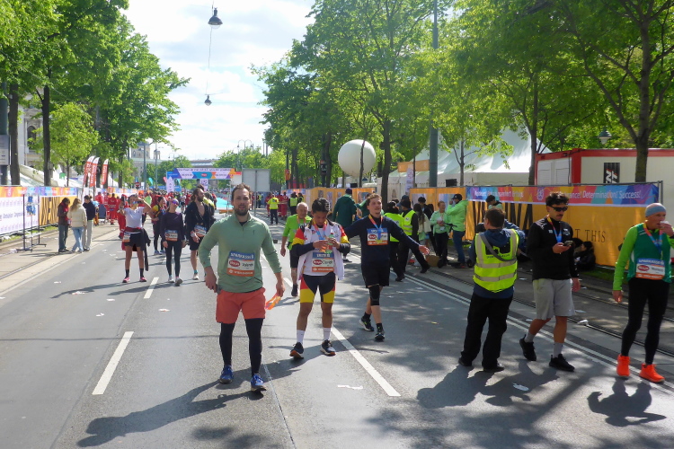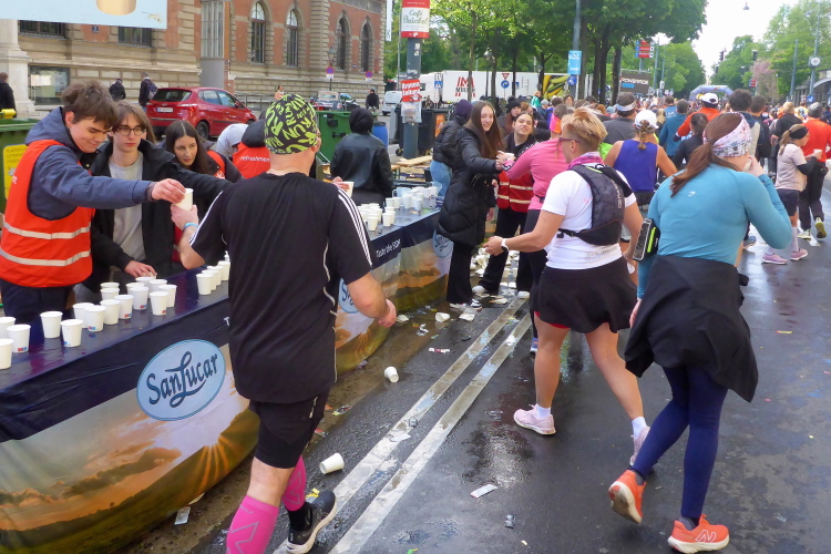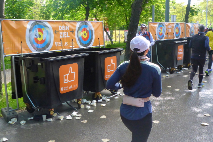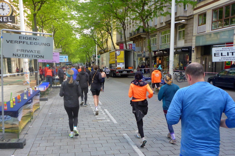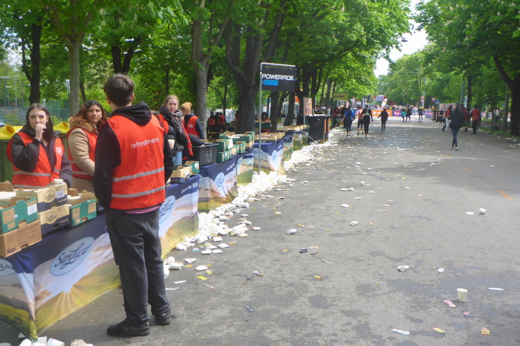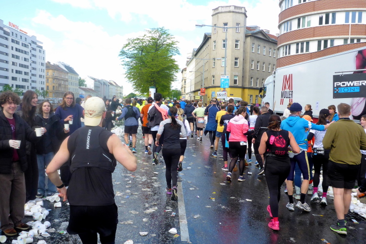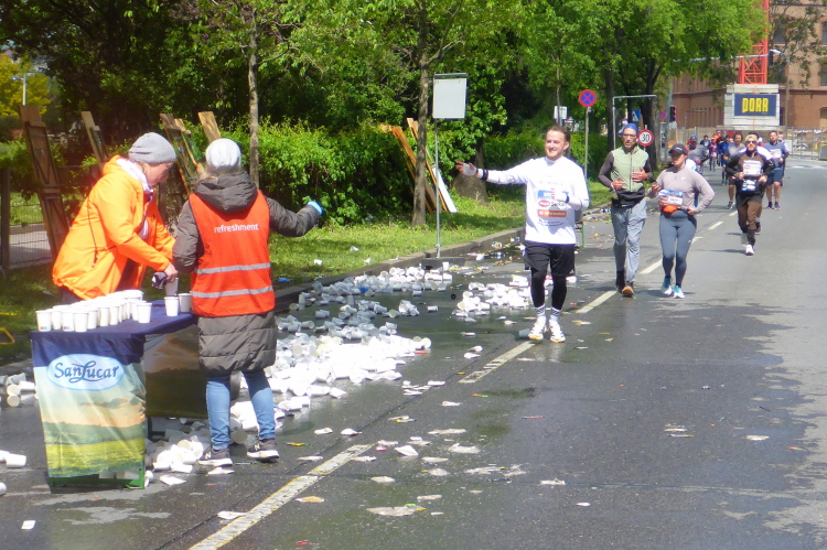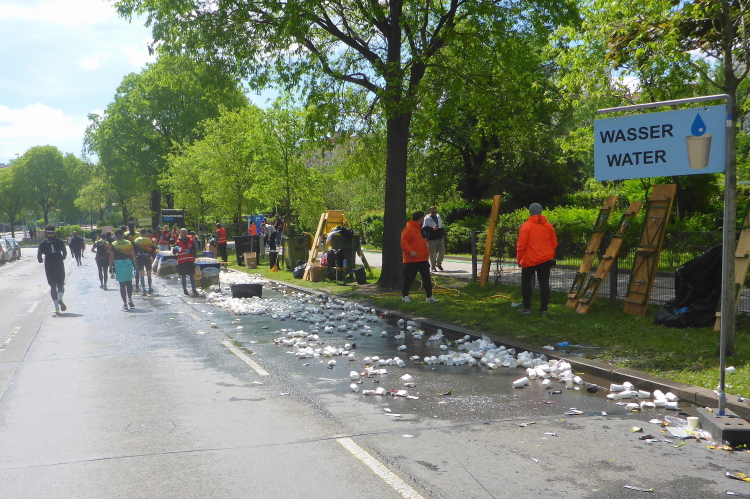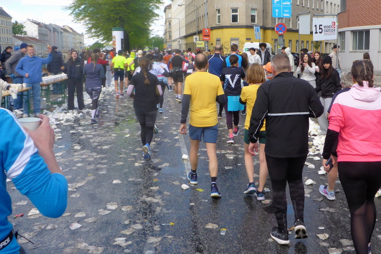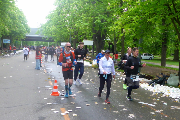 Wir erreichen die Ringe und damit die Innenstadt, der zweite VP ist dann auch der meine. Trotz großzügig geplanten Bereich, reichlich Mülltonnen mit darüber angebrachten Zielscheiben, sind leider viele meiner Mitläufer nicht fähig diese zu nutzen. Und so laufen wir durch ein schmieriges Mix aus Wasser, Geltütchen und Resten aufgeweichter Pappbecher. Ja, diese sind 100% recyclebar, aber nicht, wenn Sie aufgeweicht plattgetrampelt werden. Liebe Mitläufer, hier ist meines Erachtens Umdenken überfällig.