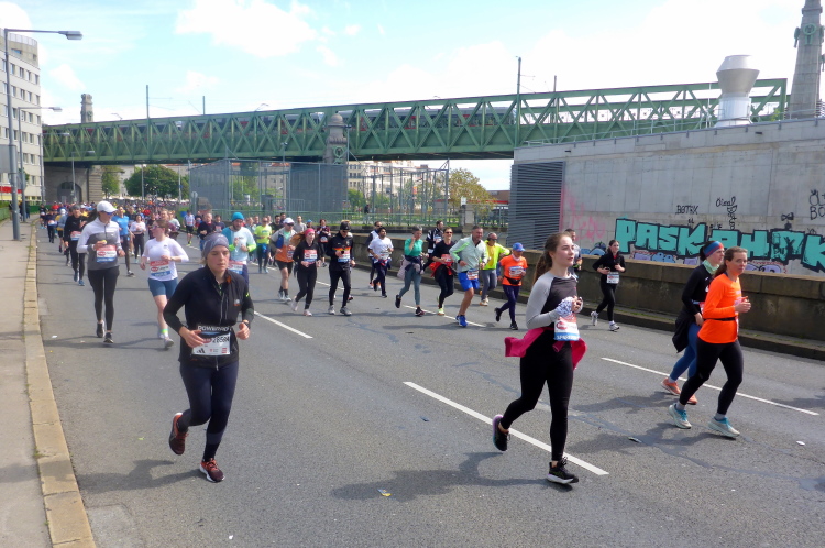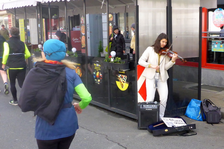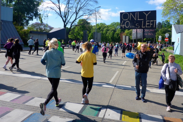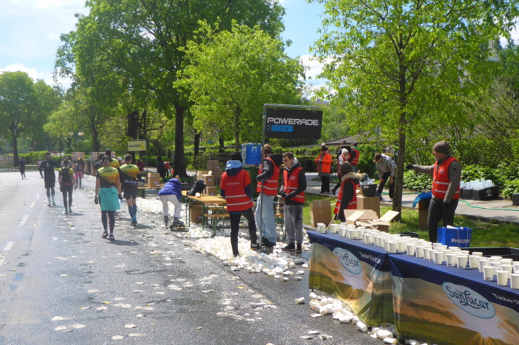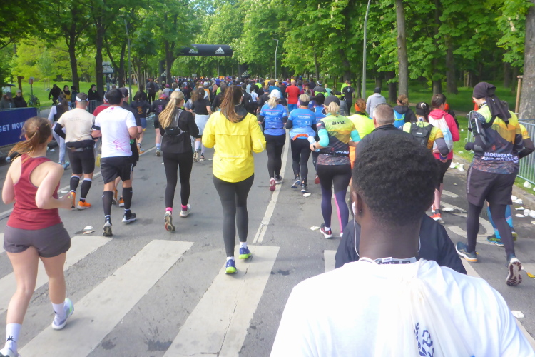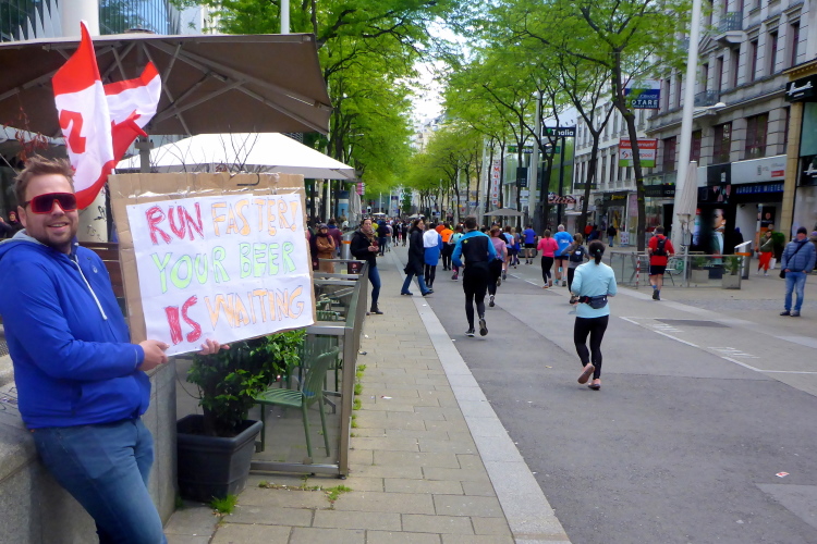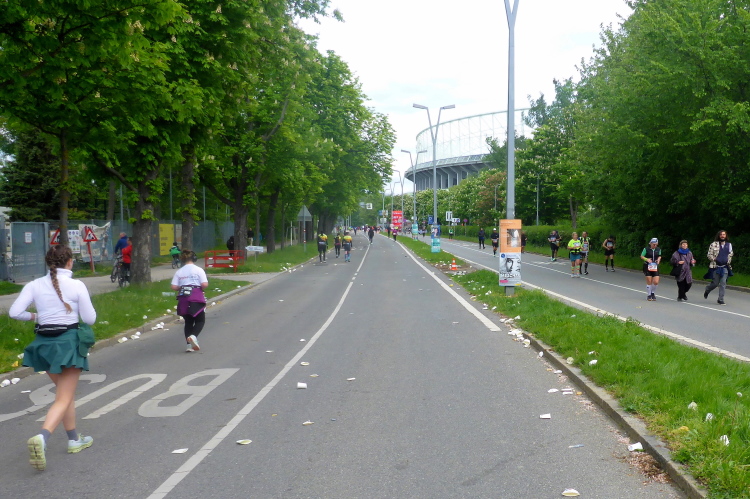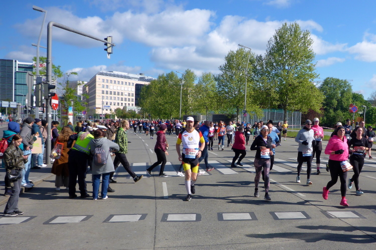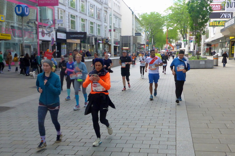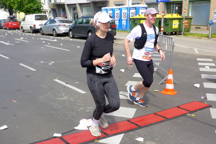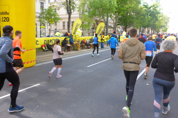 Wir erreichen die Ringe und damit die Innenstadt, der zweite VP ist dann auch der meine. Trotz großzügig geplanten Bereich, reichlich Mülltonnen mit darüber angebrachten Zielscheiben, sind leider viele meiner Mitläufer nicht fähig diese zu nutzen. Und so laufen wir durch ein schmieriges Mix aus Wasser, Geltütchen und Resten aufgeweichter Pappbecher. Ja, diese sind 100% recyclebar, aber nicht, wenn Sie aufgeweicht plattgetrampelt werden. Liebe Mitläufer, hier ist meines Erachtens Umdenken überfällig.